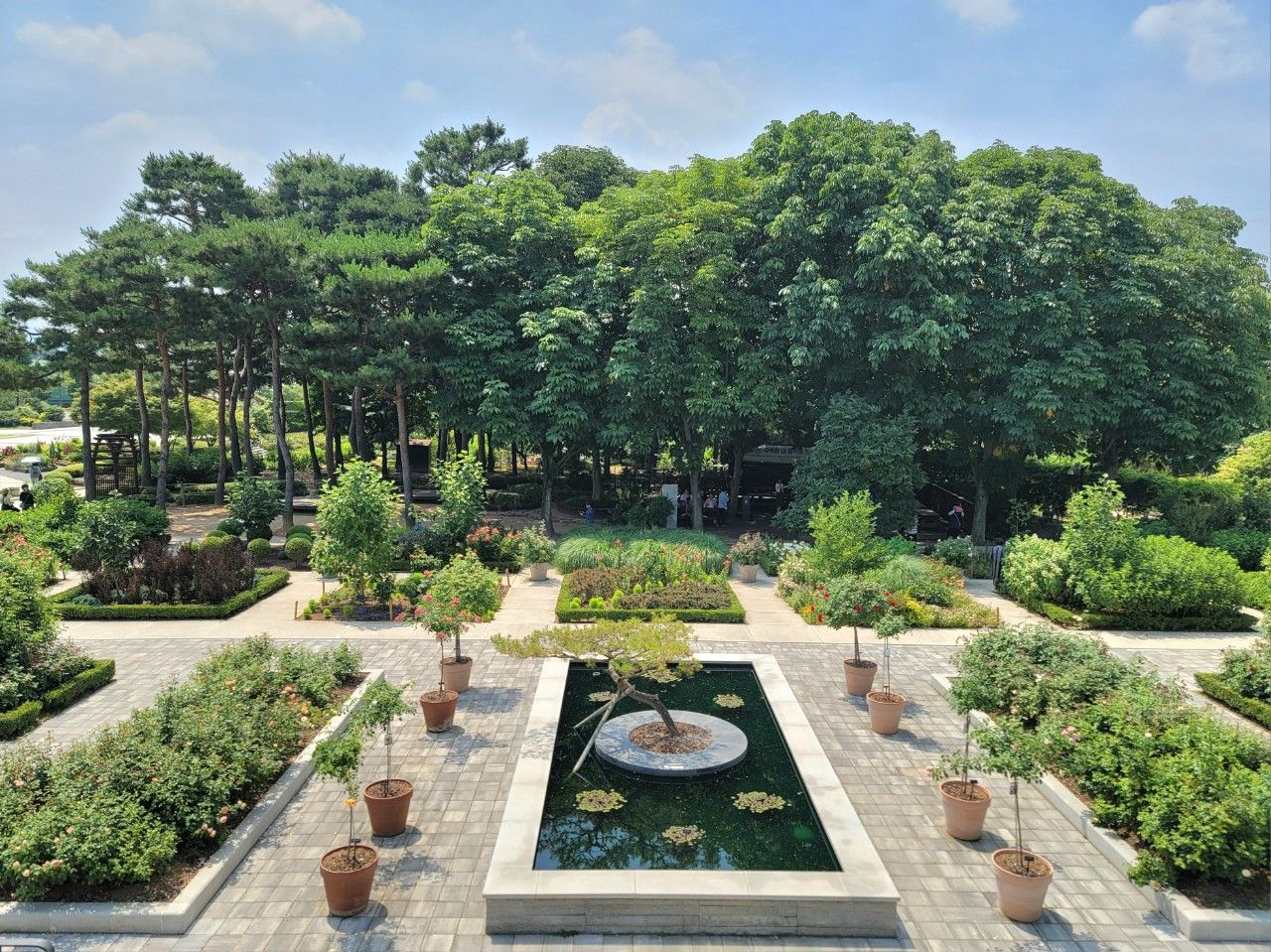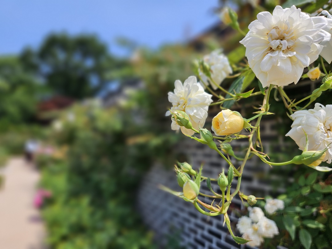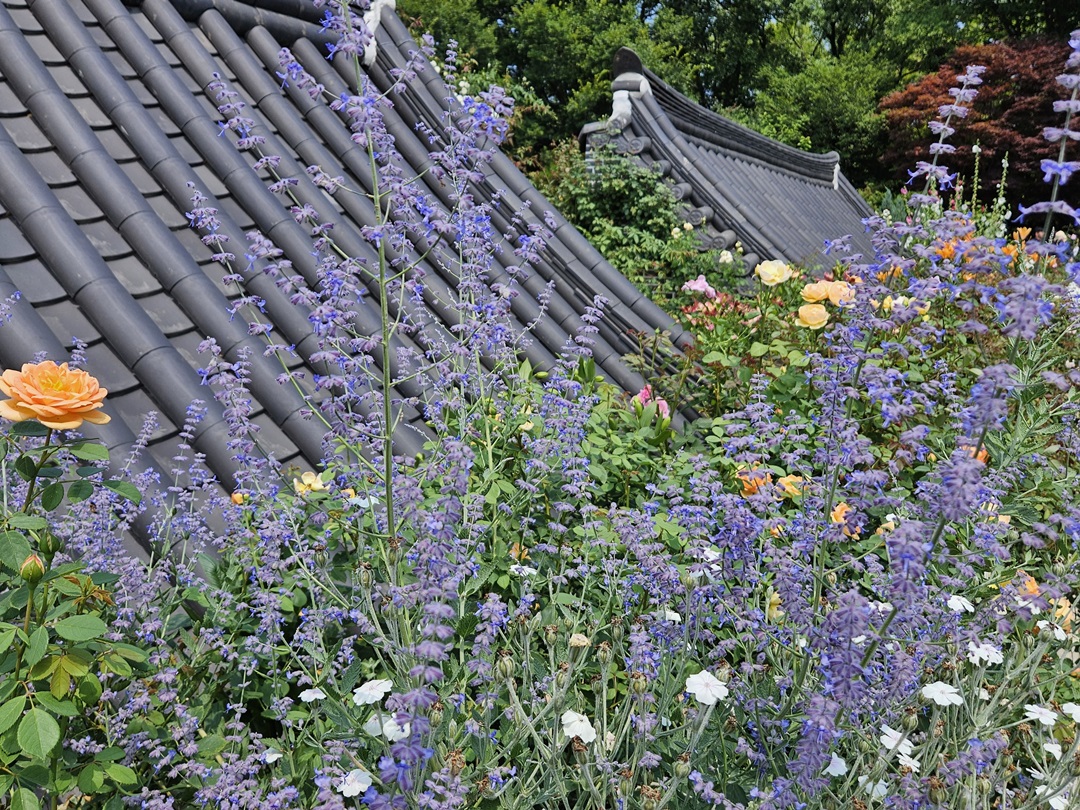 폭포 지나 바로 장미원에 도착할 수 있는데요. '장미의 뜨락'이라고도 하는 이곳은 특이한 기와지붕과 장미, 여러 가지 꽃들로 가득한 곳이었습니다.