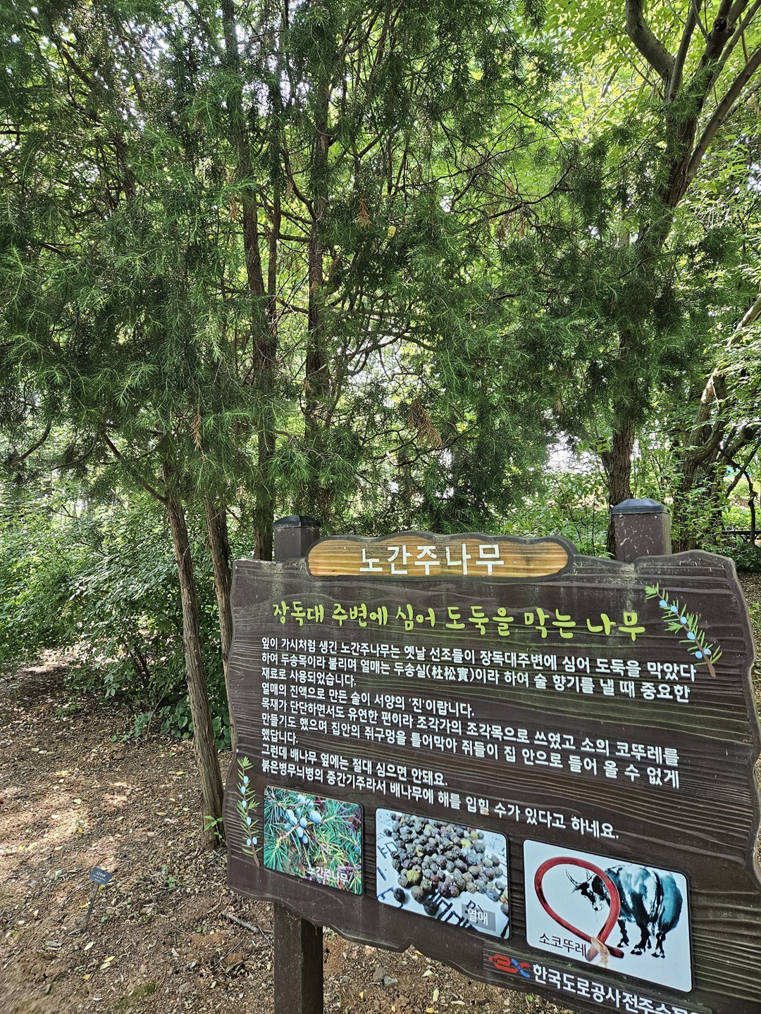 수생식물원 가는 길에 특이한 나무들을 만나볼 수도 있었는데요. 잎이 가시처럼 생긴 무시무시한 나무들이었습니다. 첫 번째 노간주나무입니다. 장독대 주변에 심어 도둑을 막았다고 하네요. 술을 만들 때 사용하기도 했다고 하고 소의 코뚜레로 쓰인 나무라고 해 반갑기도 했습니다.
