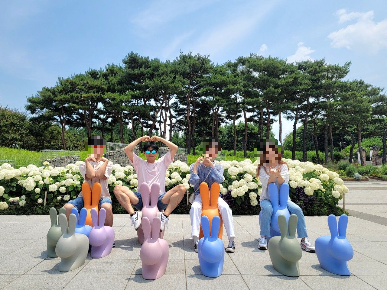 수국 앞쪽에 작은 토끼 의자들이 많이 있어서 앉아도 보고 두 마리 토끼도 잡은 둘째 꼬맹이~~