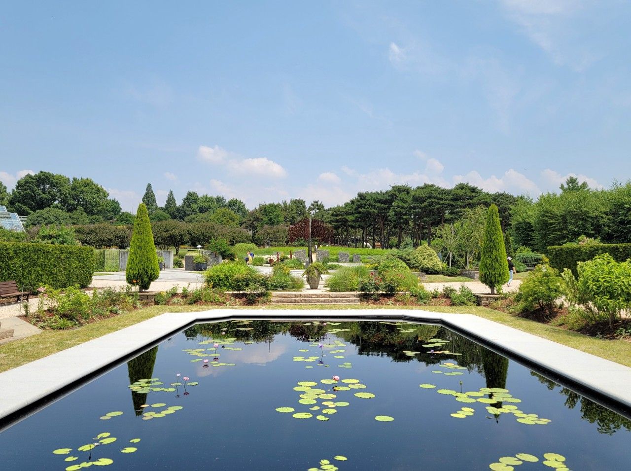 허브원에 있는 작은 연못인데요~ 여백의 미가 느껴지는 수련이 아주 고상하게 떠 있었습니다. 아쉽게도 가까이 가서 볼 수는 없었는데요. 테두리로 출입금지 줄이 쳐져 있었습니다.