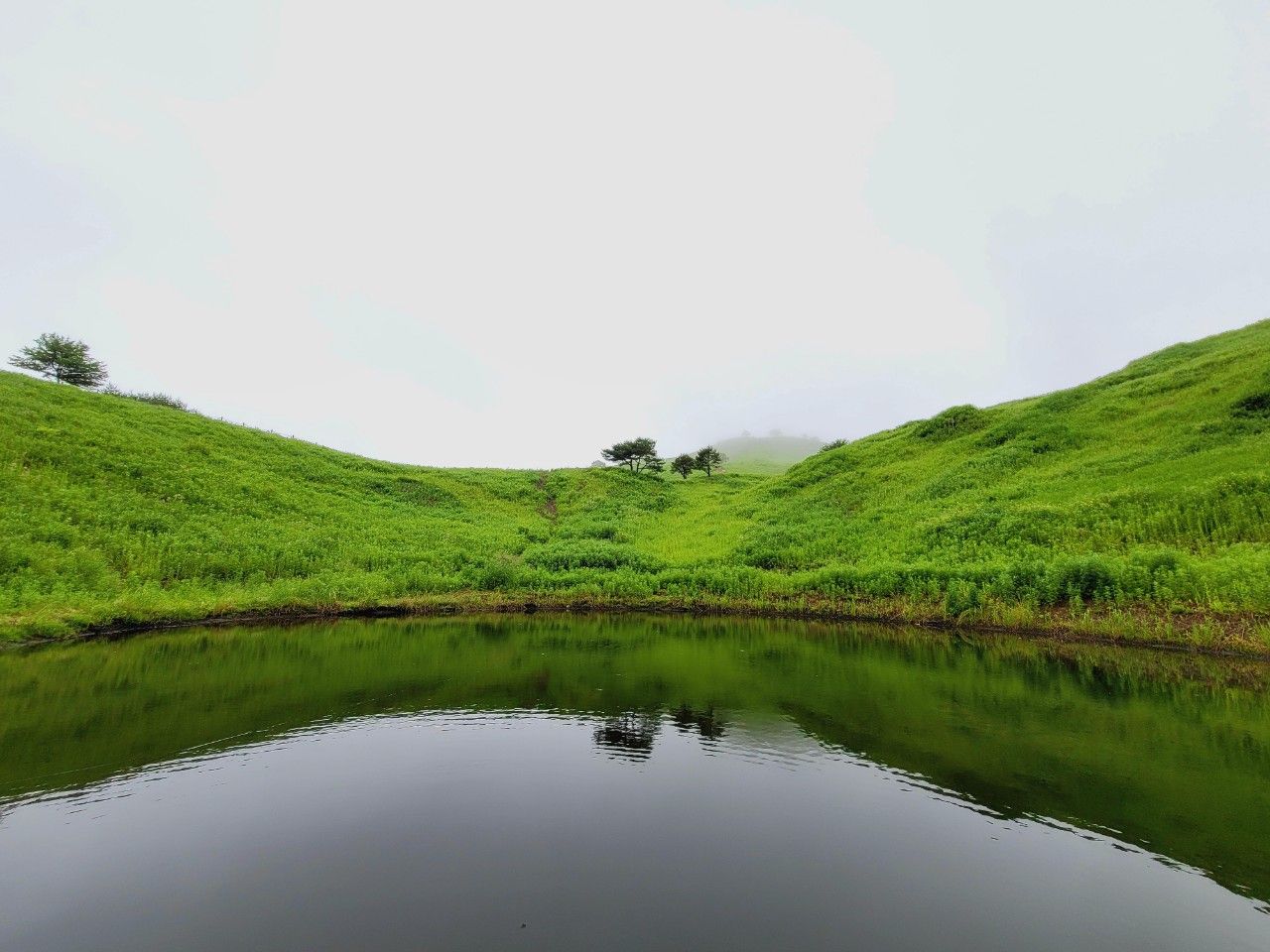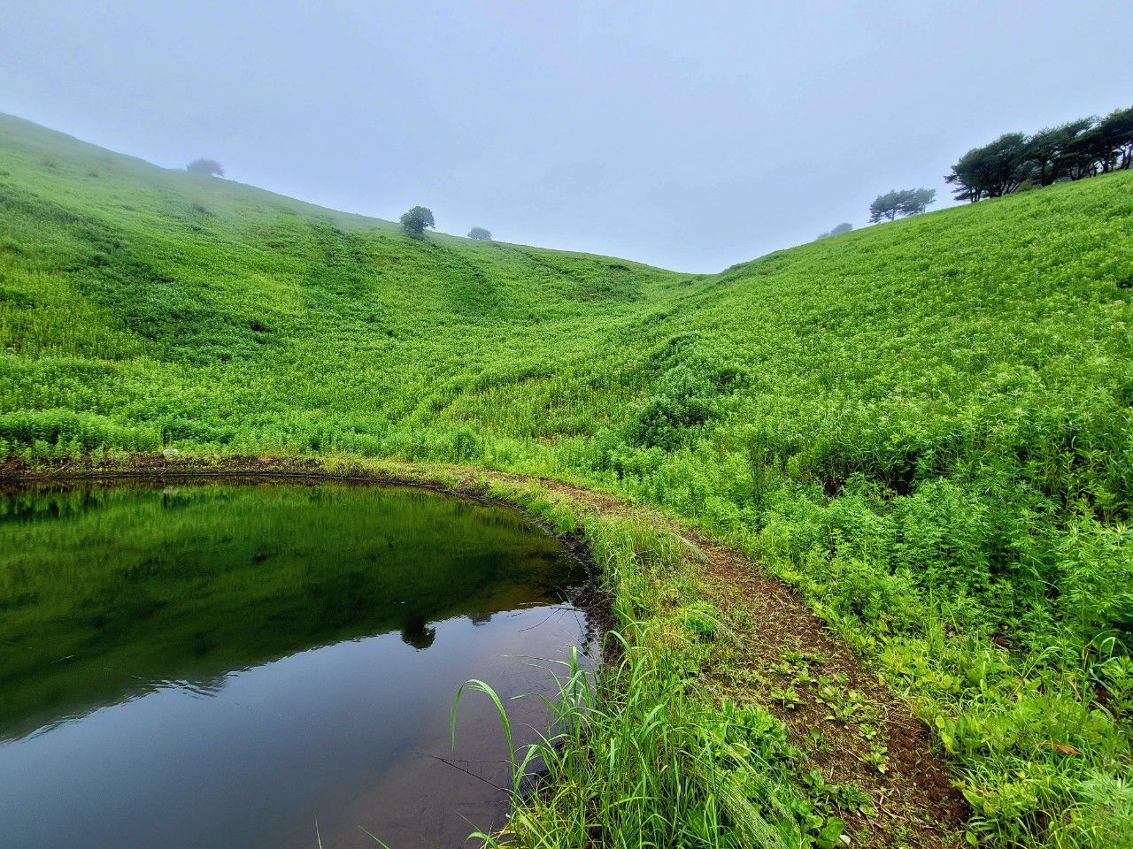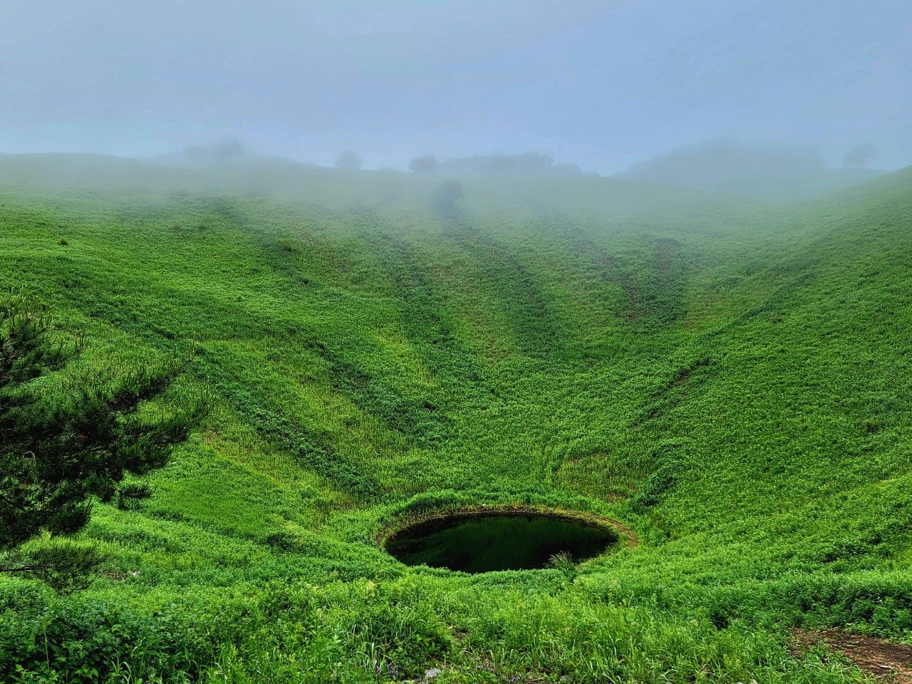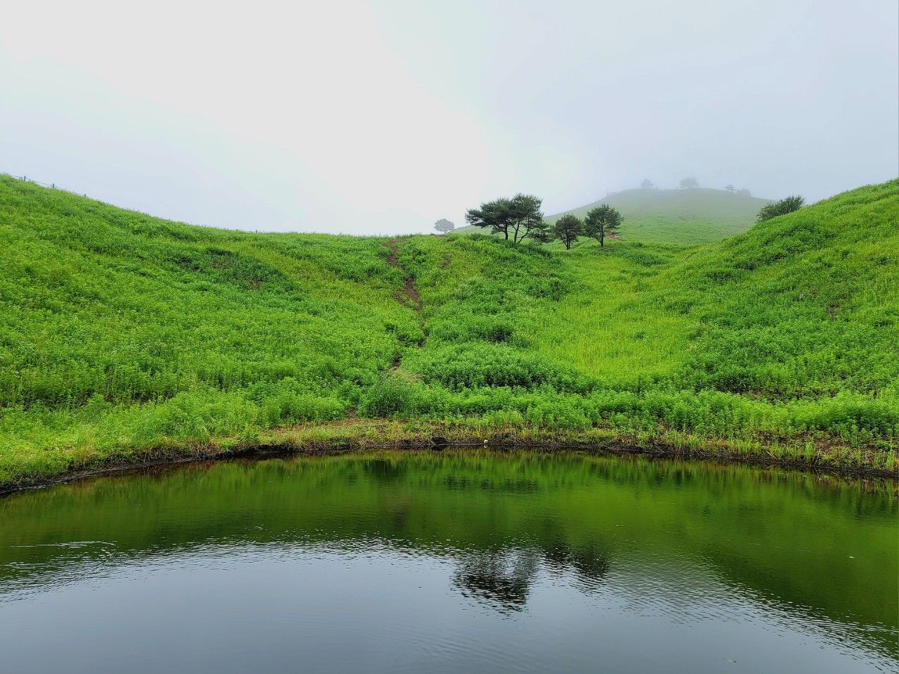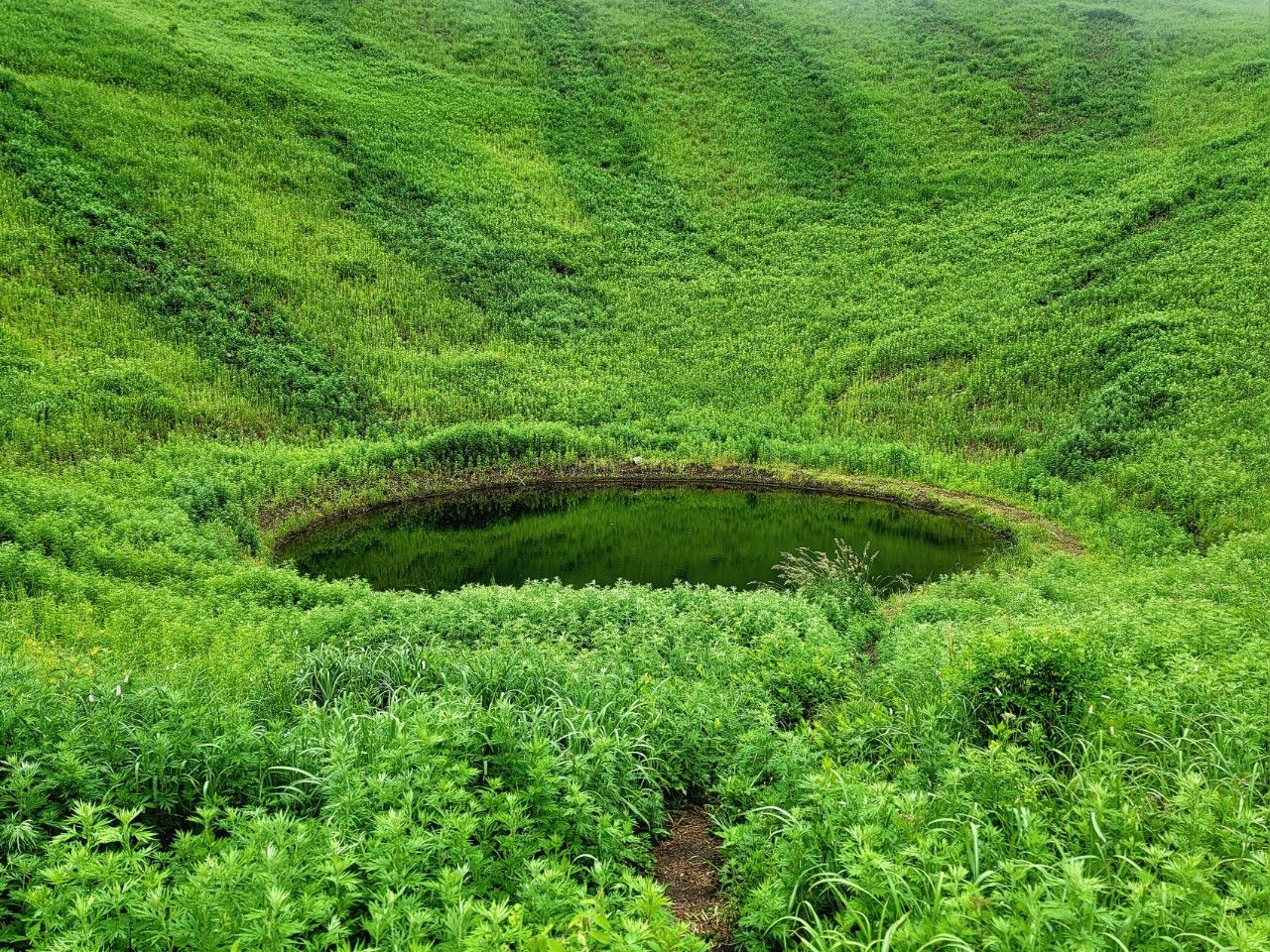 돌리네 지형입니다. 뭔가 민둥산의 눈처럼 보이기도 하는 것이 오묘했습니다. 주변으로 나 있는 짙은 초록선이 연못에서 무언가가 나온 흔적 같기도 하고.. 으스스
