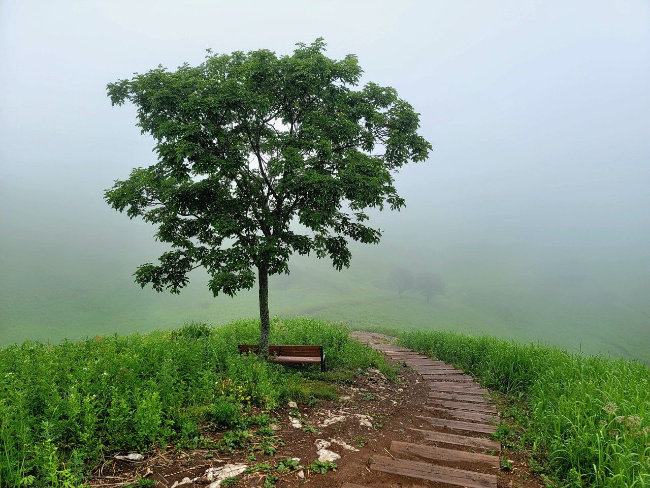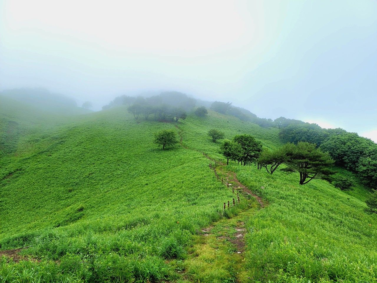 안개도 옅어지는 것 같습니다. 돌리네 지형도 아주 잘 보이네요~ 나무그늘에 신선님이 계실 것 같은 느낌도 들고..