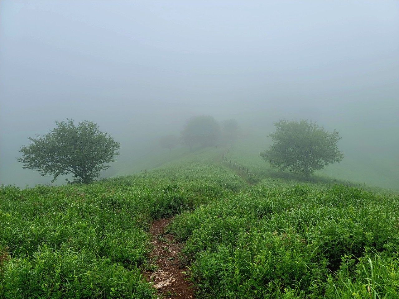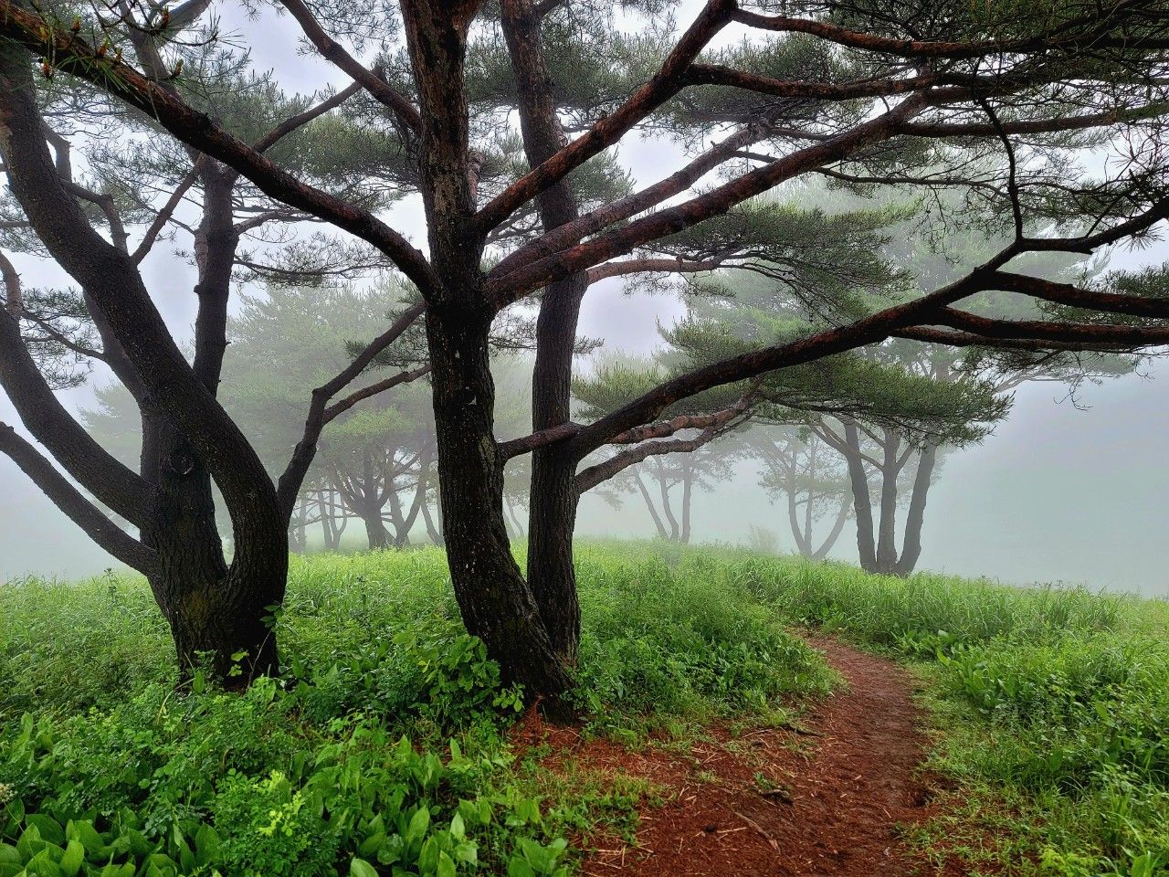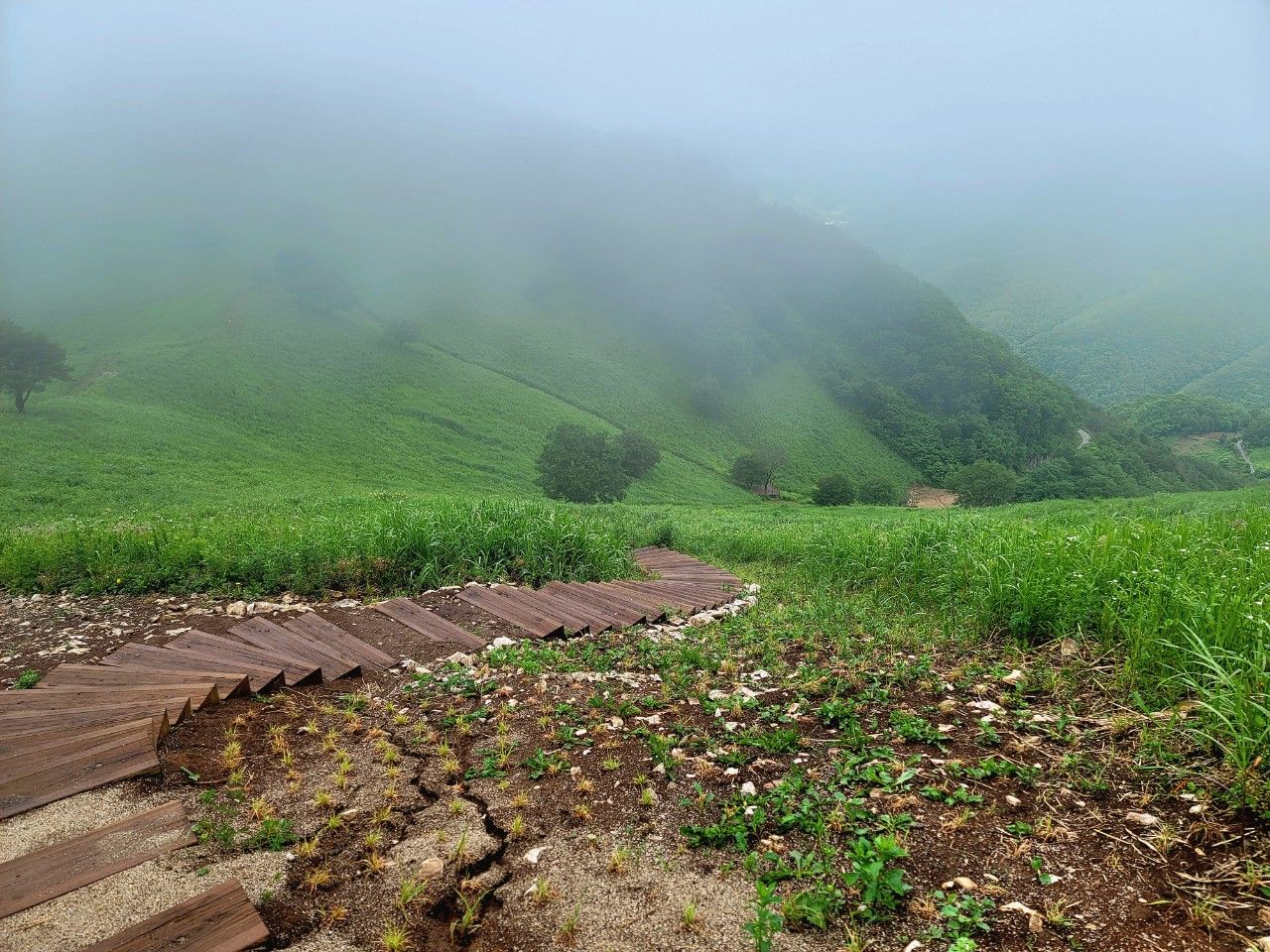 안개도 옅어지는 것 같습니다. 돌리네 지형도 아주 잘 보이네요~ 나무그늘에 신선님이 계실 것 같은 느낌도 들고..