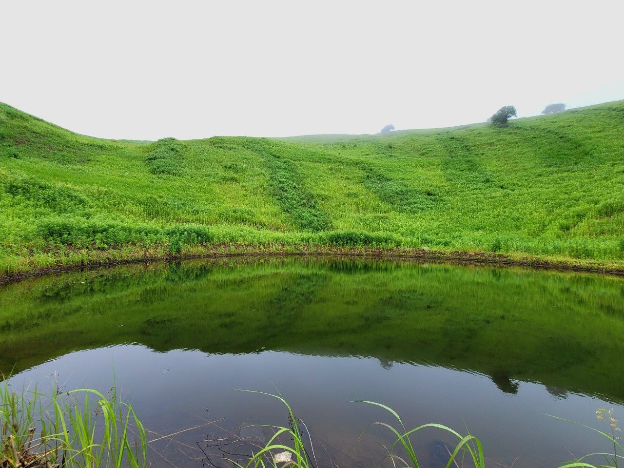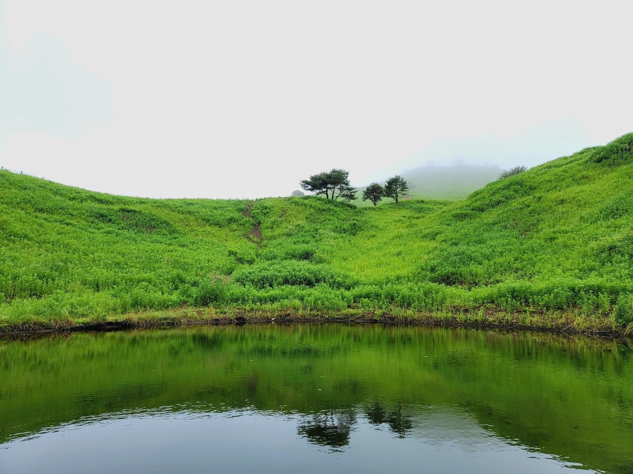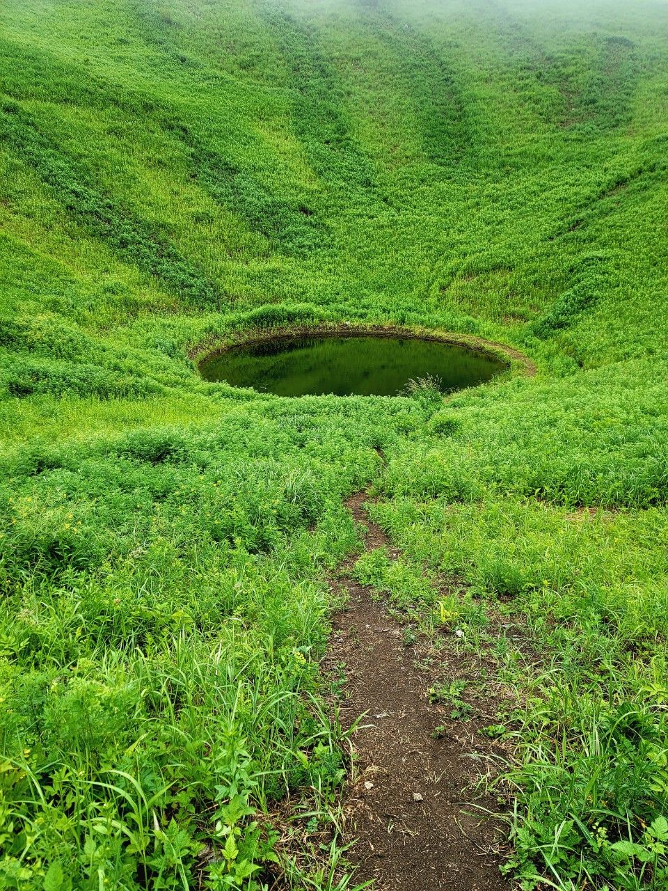 돌리네 지형입니다. 뭔가 민둥산의 눈처럼 보이기도 하는 것이 오묘했습니다. 주변으로 나 있는 짙은 초록선이 연못에서 무언가가 나온 흔적 같기도 하고.. 으스스