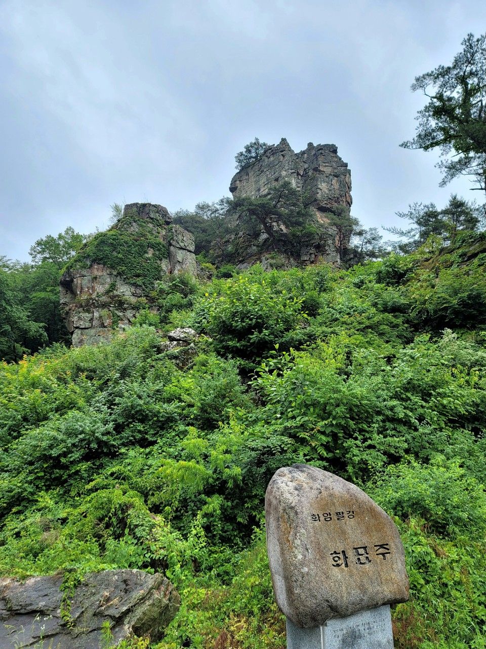 화암팔경 중 제5경인 화표주입니다. 화암리 절벽 위에 세워진 두 개의 돌기둥 망주석이라고 하는데요. 저 두 돌기둥에 신틀을 걸고 짚신을 삼았다는 전설이 전해지는 신기한 바위였습니다.