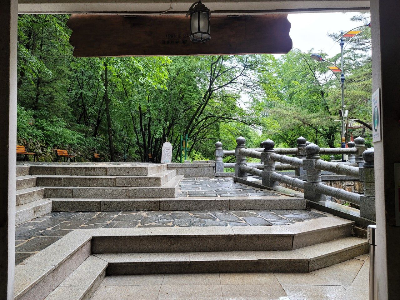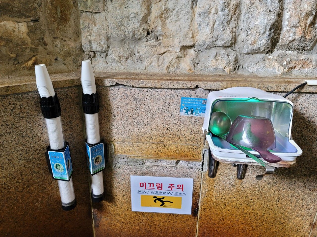 청결하게 잘 관리되고 있었는데요. 앞에 보이는 종이컵에 따라서 마시면 된다고 합니다. 국자로 직접 마시는 건 안된다고 안내되어 있네요. 바닥에 물기가 있으니 조심~~