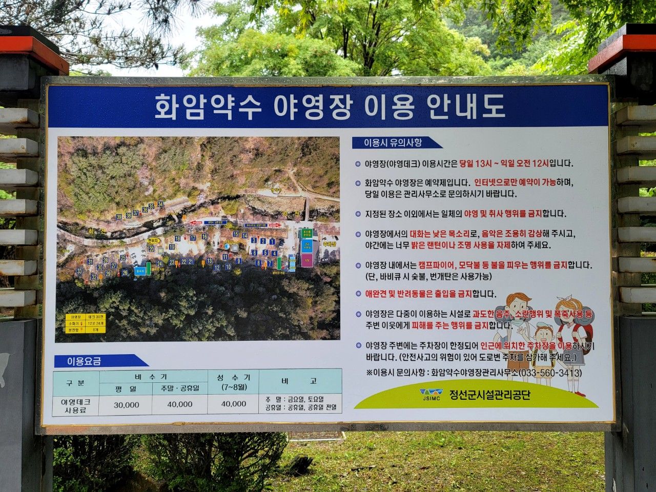 화암약수 야영장 이용 안내도 잠깐 살펴보았구요~ 야영데크 사용료가 비수기 평일에는 30,000원, 비수기 주말이나 공휴일, 성수기에는 40,000원이었습니다.