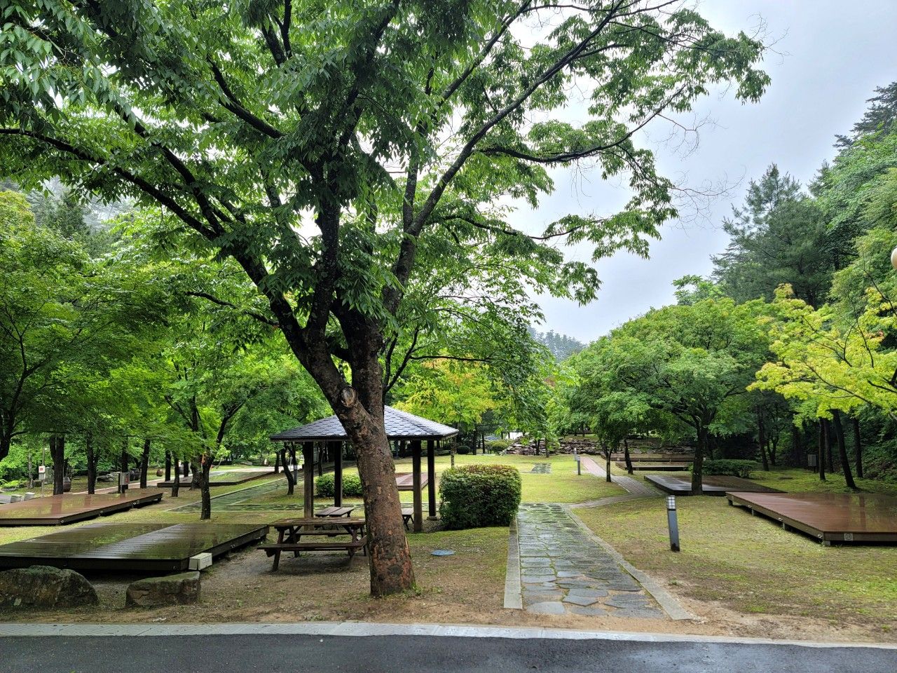 데크가 아주 큼지막하니 야영장이 아주 깔끔했구요. 맑은 날에는 나무그늘이 시원할 것 같았습니다.