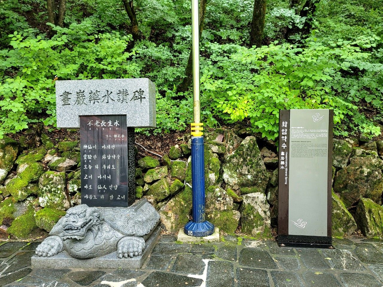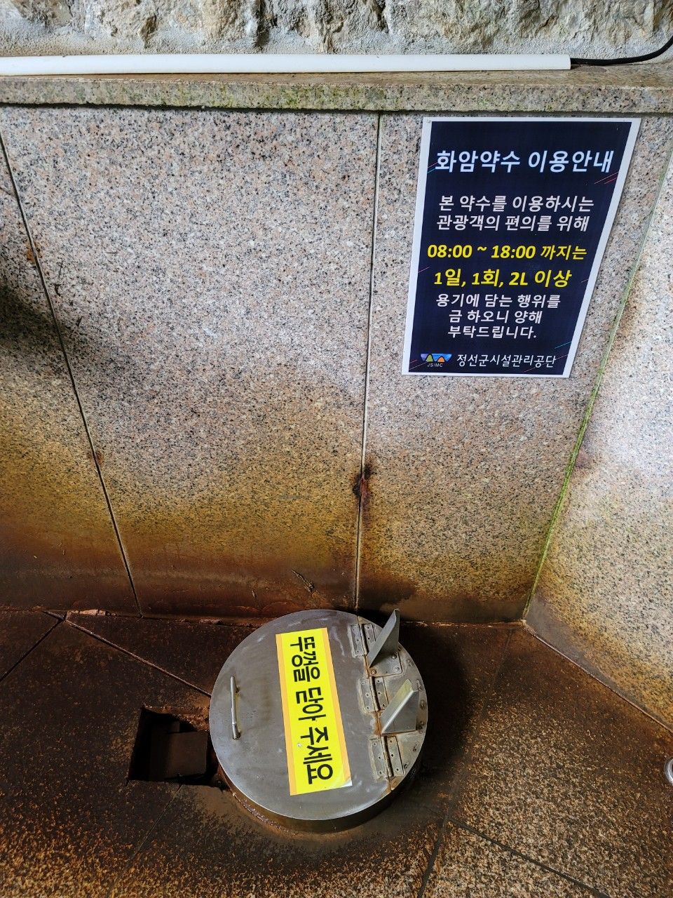 뚜껑을 덮어놓았네요~주변으로 보이는 철분의 흔적들이 강력한 약수맛이 날 것만 같았습니다. 맛이 강력한 만큼 화암약수가 위장병, 피부병, 안질, 위암에도 효과가 있다고 합니다.