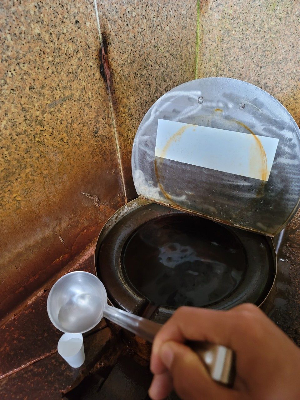 여기저기 철분의 흔적이 가득합니다. 준비되어 있는 종이컵에 국자로 정성껏 따라서 마셔보았는데요. 으~~~ 강력한 탄산녹물맛이 납니다.^^