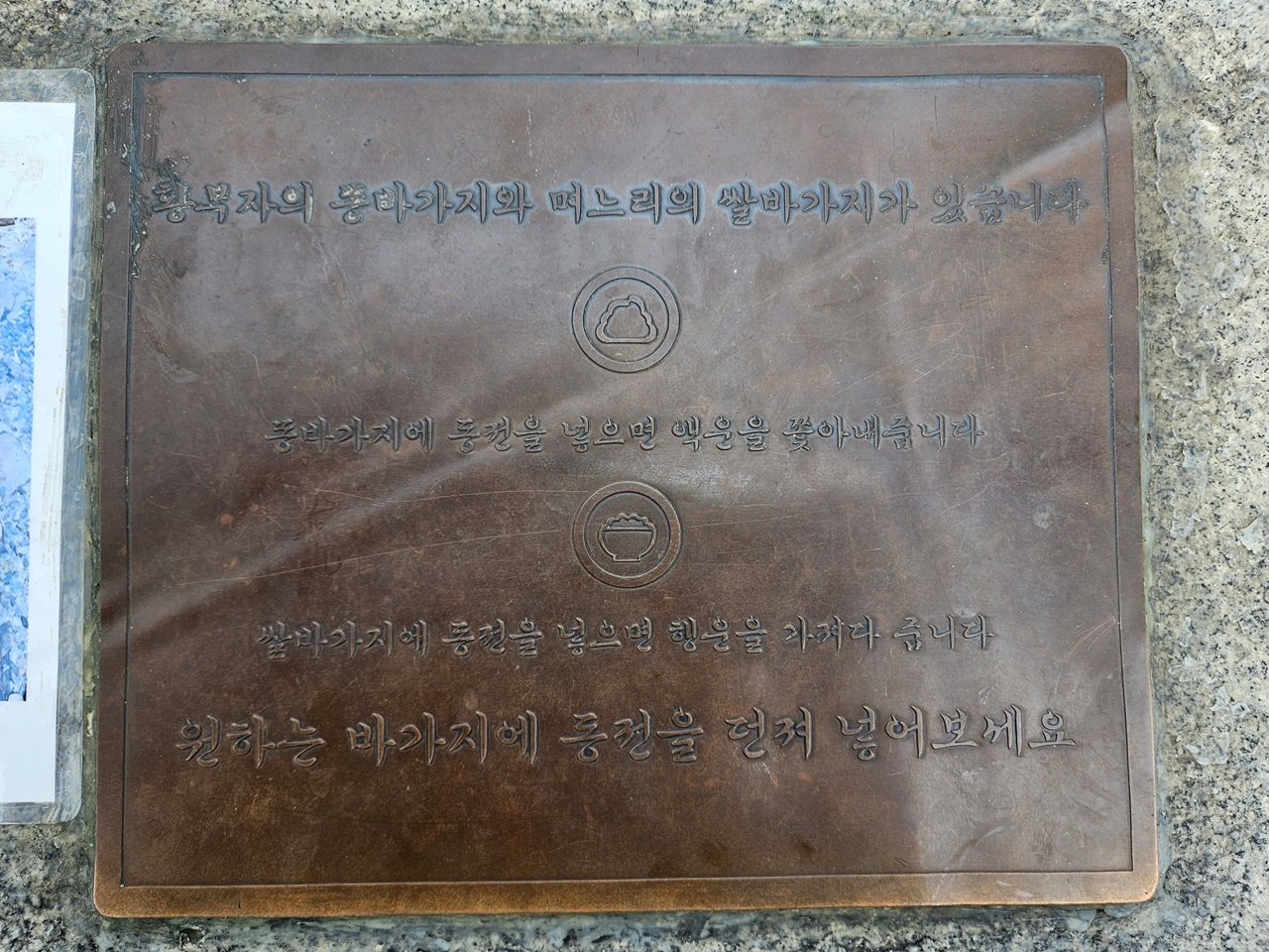 연못에 있는 바가지에 대한 설명도 있었어요. 똥바가지에 동전을 넣으면 액운을 쫓아내 주고, 쌀바가지에 동전을 넣으면 행운을 가져다준다고 합니다. 동전을 가지고 갔으면 던져보고 싶었는데 동전이 없어서 아쉬웠습니다.