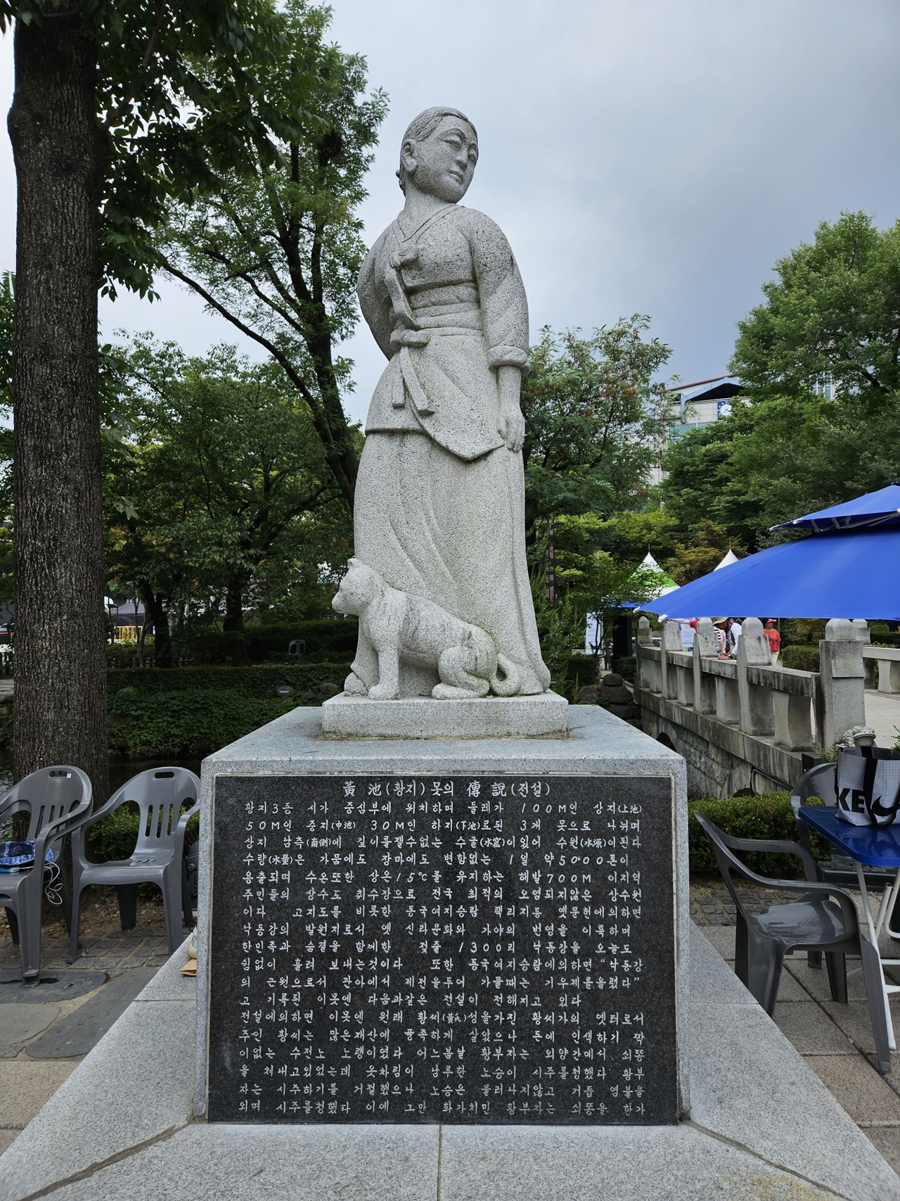 안타까운 황지연못의 전설도 있었는데요. 욕심 많은 황부자가 시주를 청하는 스님께 소똥을 한 바가지 퍼부어주었고 이에 쌀을 시주하며 며느리가 시아버지의 용서를 빌었다고 해요. 스님이 화를 면하고자 하면 따라오되 뒤를 돌아보지 말라고 했지만 하늘이 무너지는 소리에 뒤를 돌아봐 며느리는 돌로 변하고 꺼진 땅에 황지연못이 생겼다고 합니다. 뒤를 슬쩍 바라보는 며느리상이네요. 아주 흥미로운 전설입니다.^^