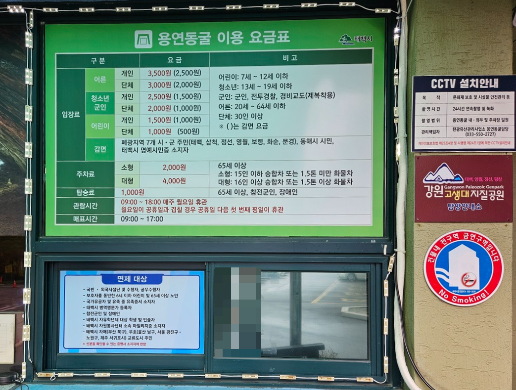 용연동굴 입장료와 주차료인데요. 입장료 면제 대상은 용연열차(동굴 입구까지 타고 가는 열차) 비용이 1,000원 있네요.