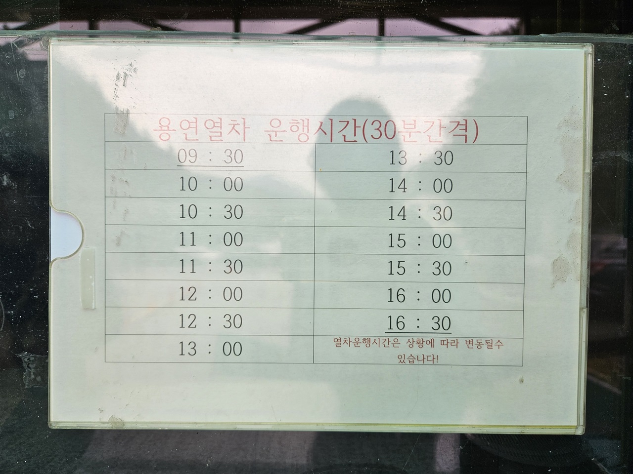 매표소에서 출발하는 열차 운행시간은 9시 30분부터 16:30분까지 30분 간격으로 있습니다.