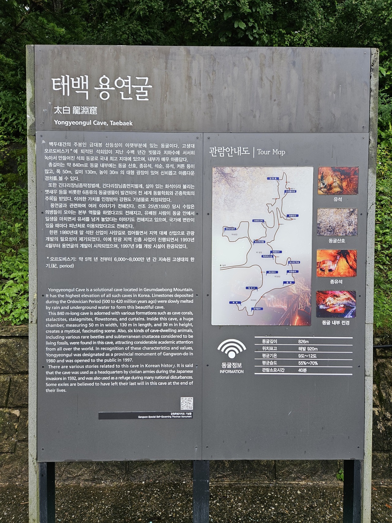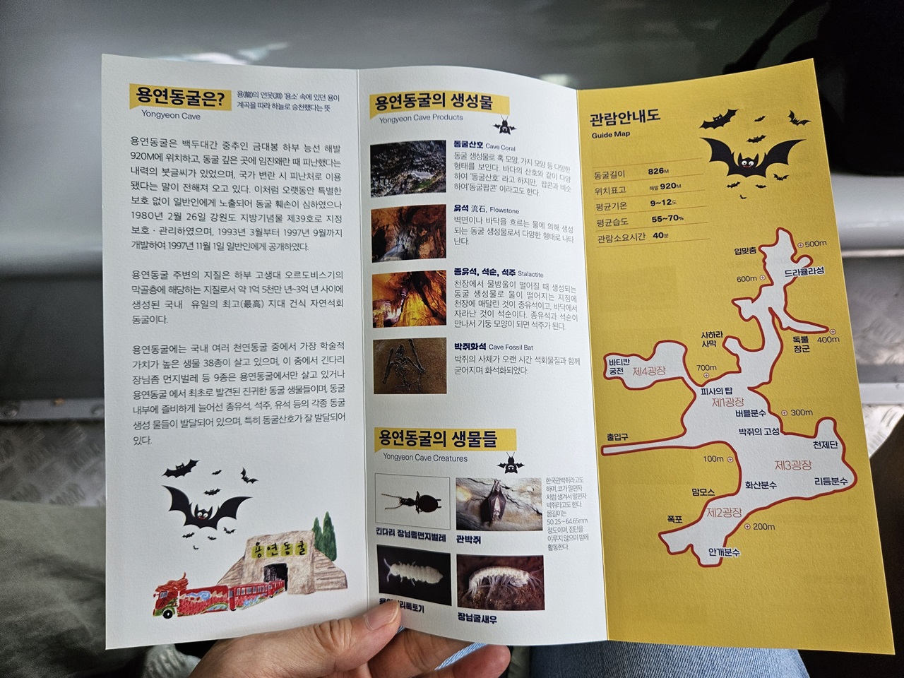 🔎 용연동굴은 강원도기념물로 지정된 곳으로 826m 관람길이의 석회암지층 국내 최고지대(해발 920m) 위치한 건식 자연석회동굴입니다. 동굴 속 희귀한 생물 38종이 서식하고 있다고 하며 자연동굴의 경관을 볼 수 있는 곳입니다.