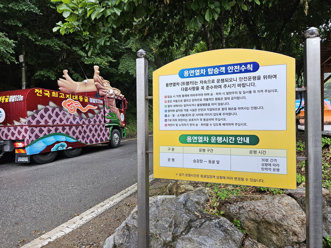 용연열차가 도착했습니다. 용모양으로 만든 열차가 특이하고 타는 재미도 쏠쏠한 것 같습니다. 안전수칙 읽어보고 출발~~