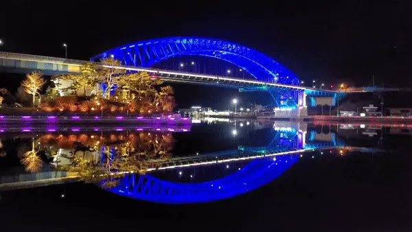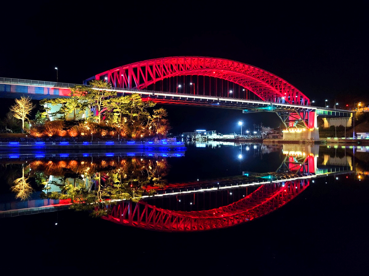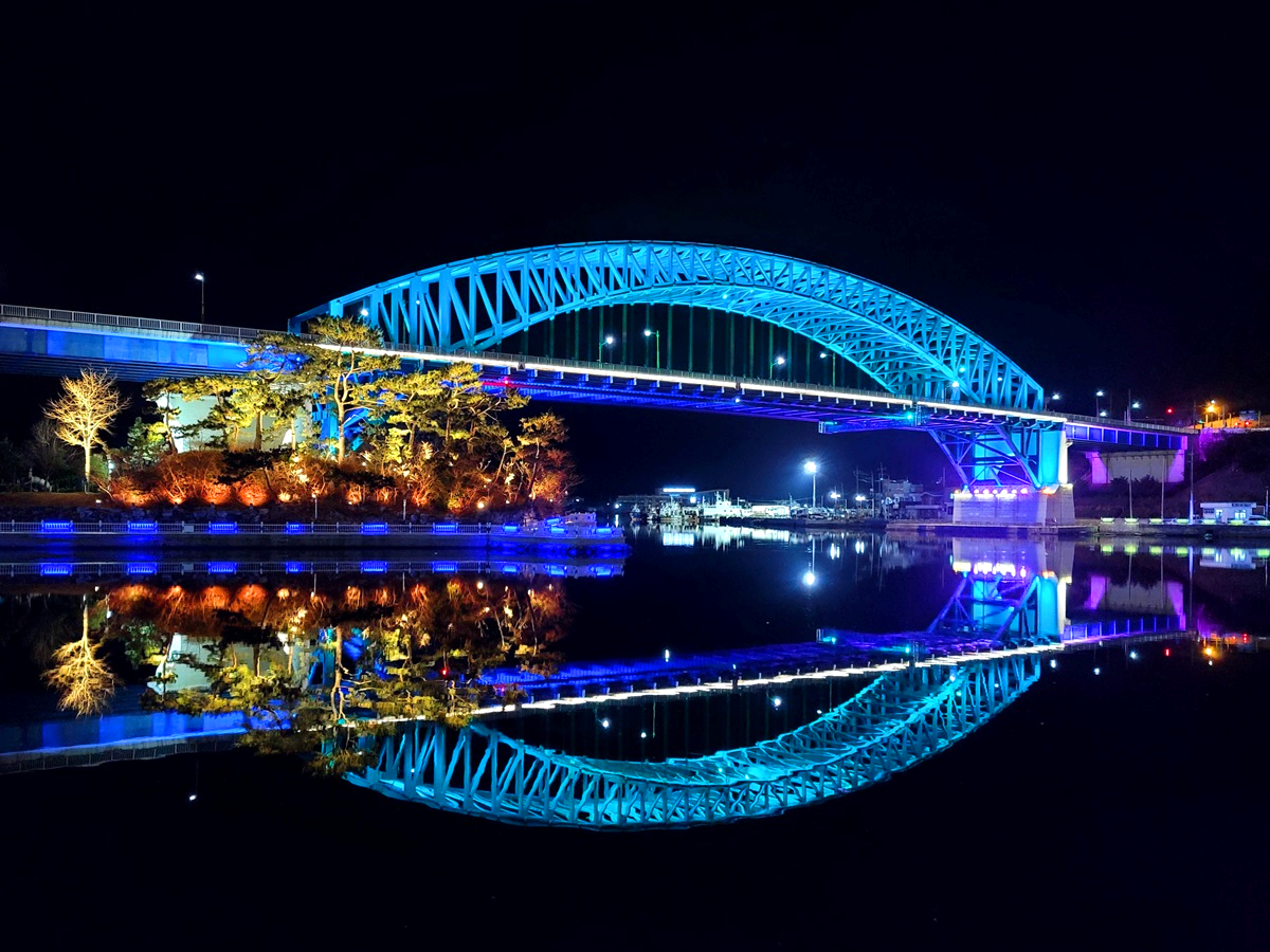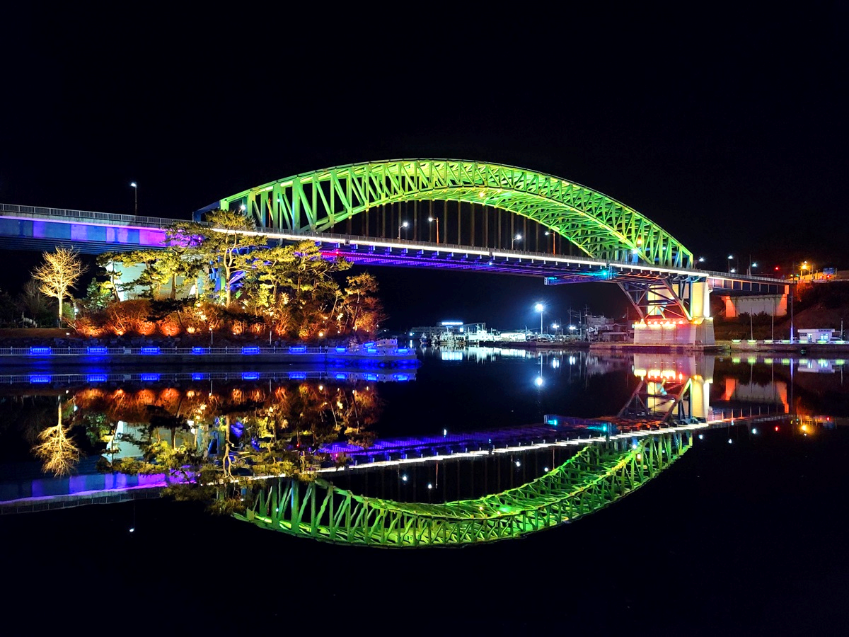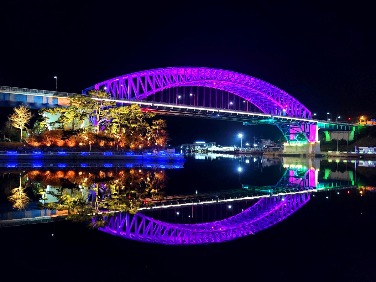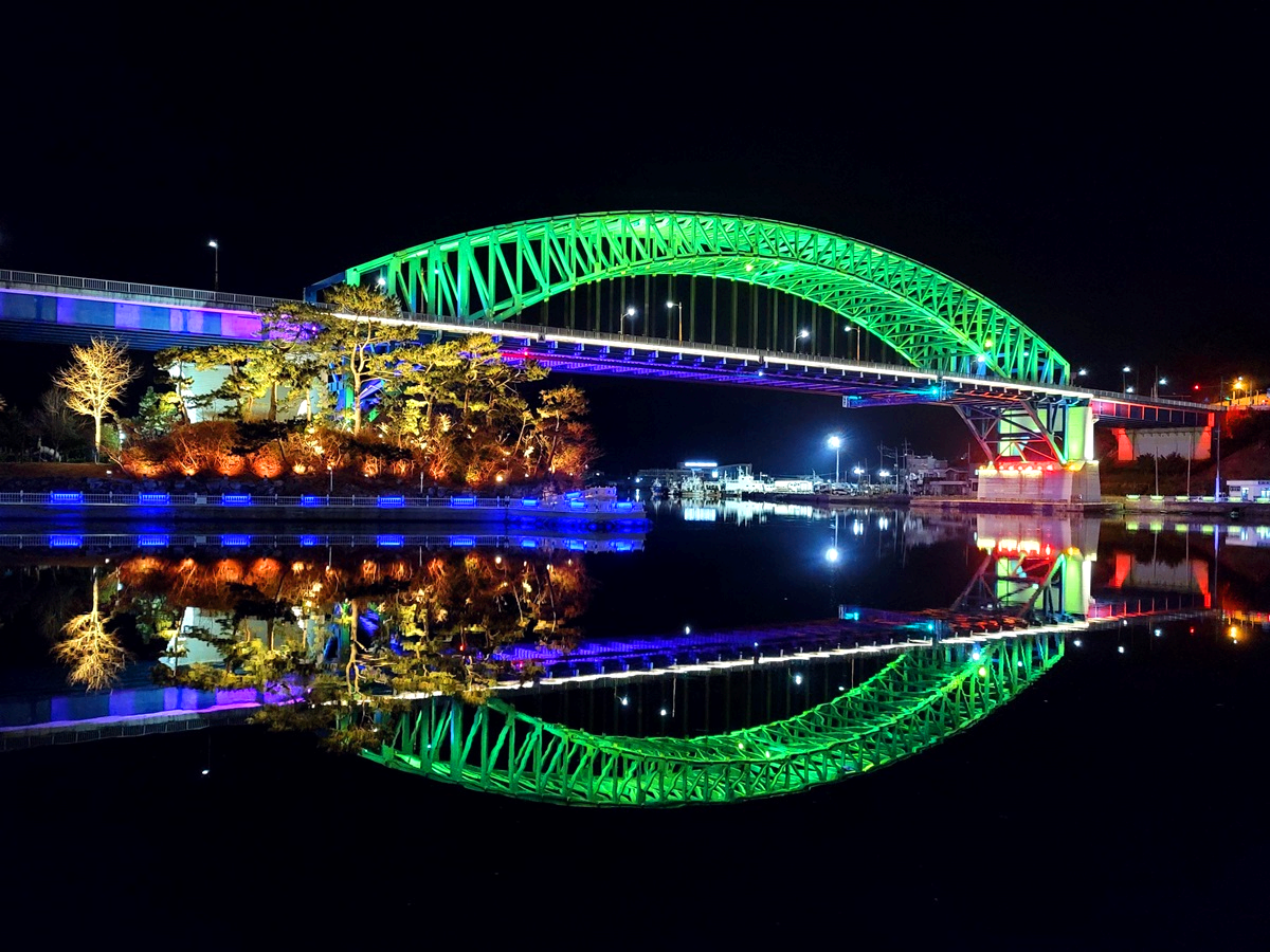 천천히 바뀌는 다리의 색깔과 바닷물에 반영된 모습이 참 화려합니다. 어두운 밤이면 그저 보이지 않을 공간을 조명이라는 도구로 생명을 불어넣은 듯합니다.