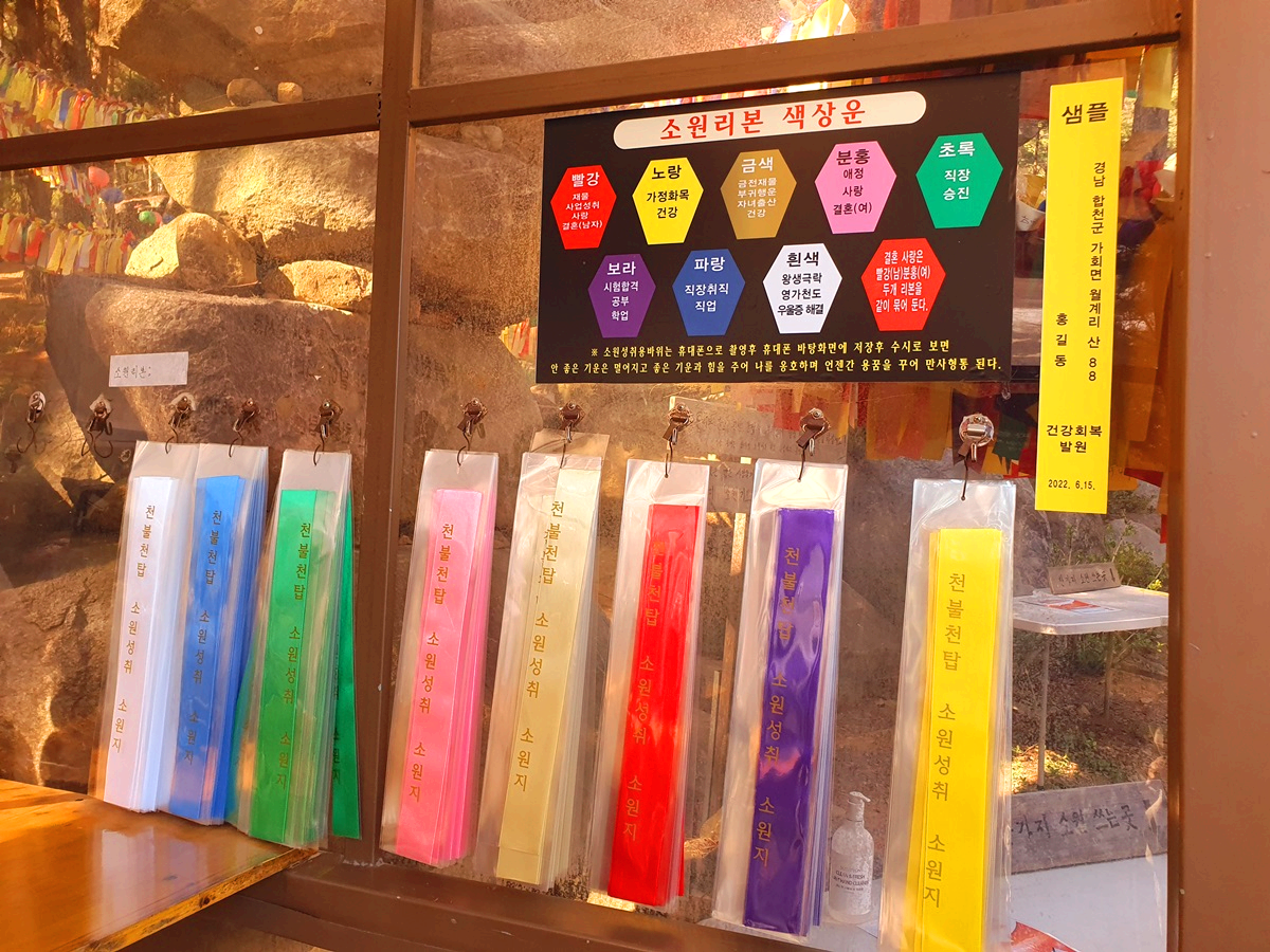 천불천탑에 있는 탑마다 불상이 모셔져 있습니다. '부처가 있는 곳이 곧 법당'이라 하는 말이 있듯 천불천탑이 있는 모든 장소가 법당이었습니다. 한 가지 소원은 들어주신다고 하는 소원성지, 만원을 복전함에 넣고 원하는 리본의 색깔을 고른 후 한 가지 소원을 쓰고 걸어두시면서 염원하시면 됩니다.