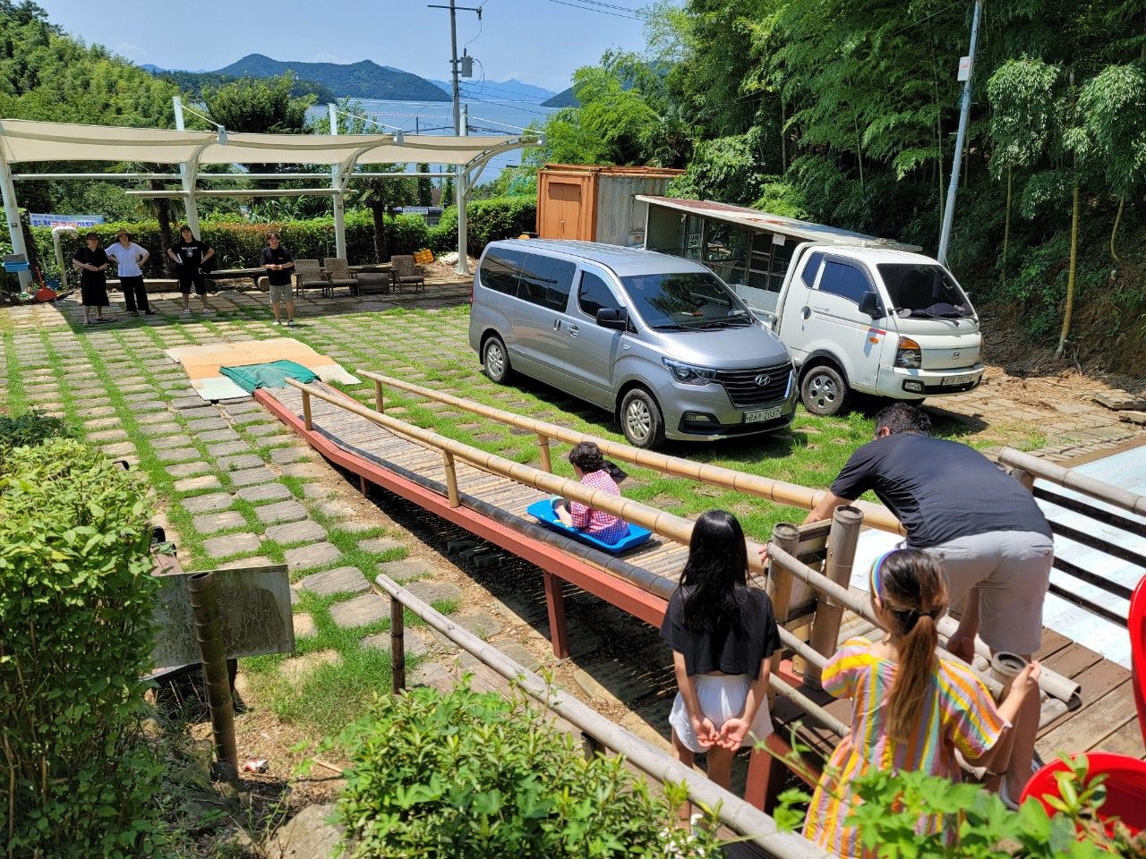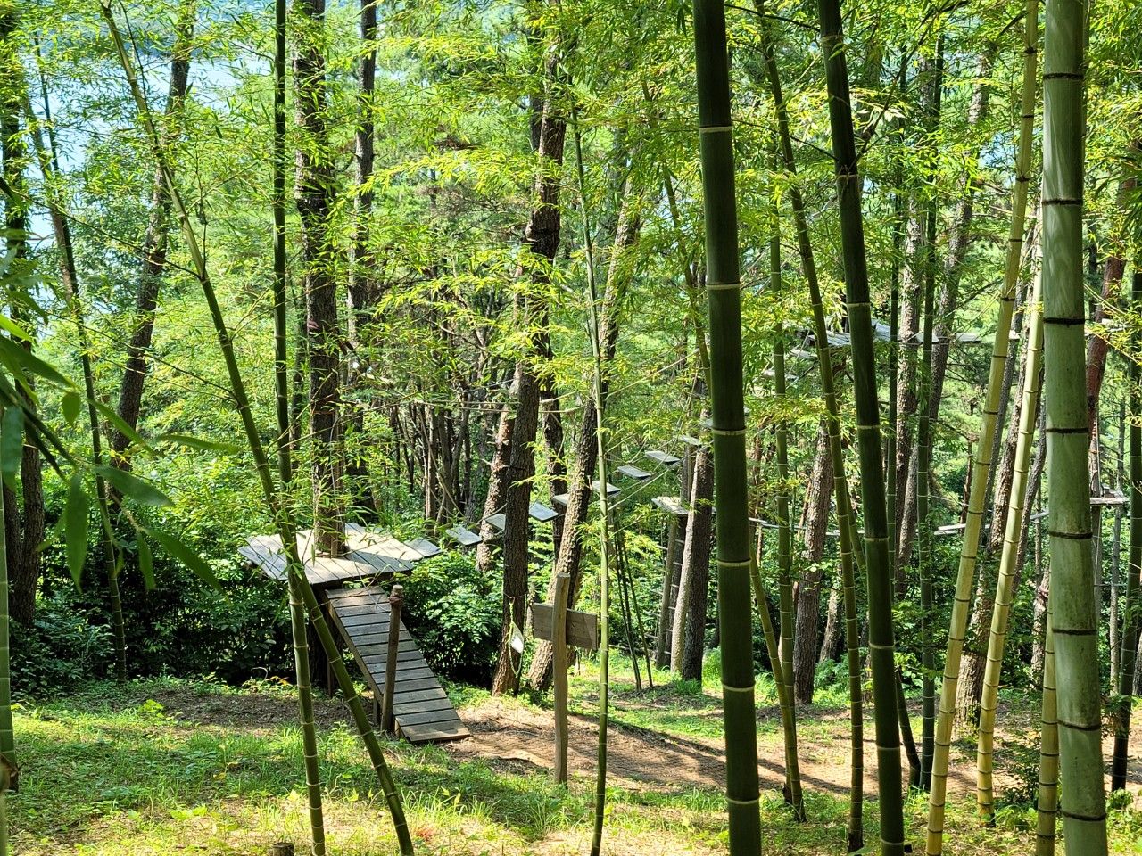 주차장 바로 옆 대나무 미끄럼틀에서는 아이들이 신나게 놀고 있었습니다. 아이디어 좋은 놀잇감이네요~