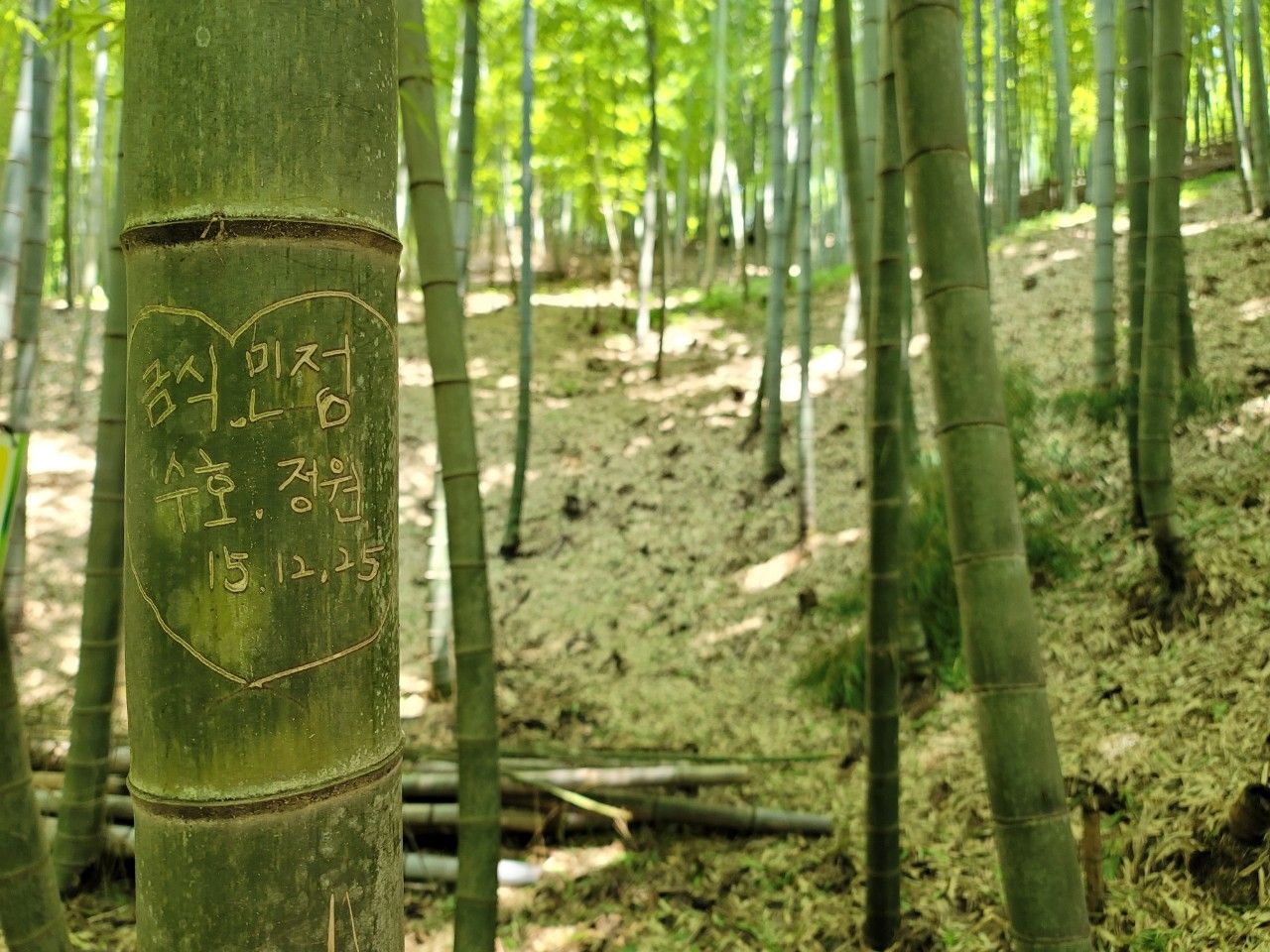 대나무 하면 똑바로 자라는 게 특징인데 이 친구는 꼬부라져 있네요. 맹종죽 숲의 사춘기 대나무인지...ㅋ