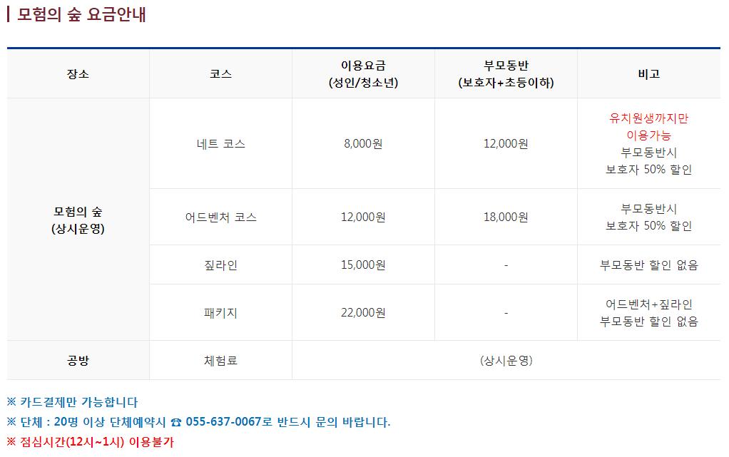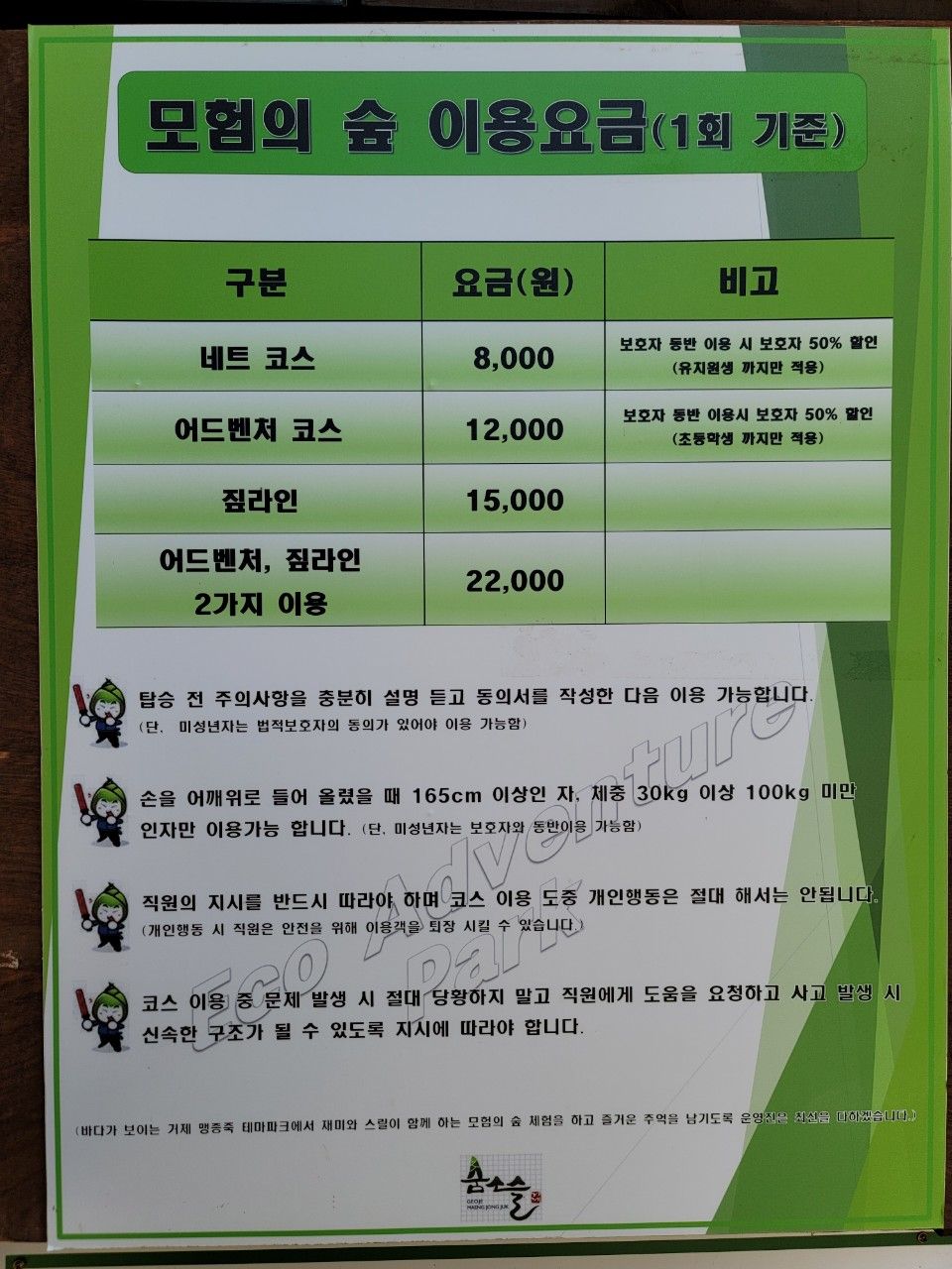 모험의 숲은 코스가 여러 가지 있어서 쉬운 코스에서 어려운 코스까지 다양하게 준비되어 있었네요. 가격은 아래 표 참고하세요~
