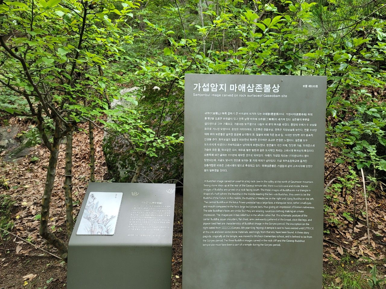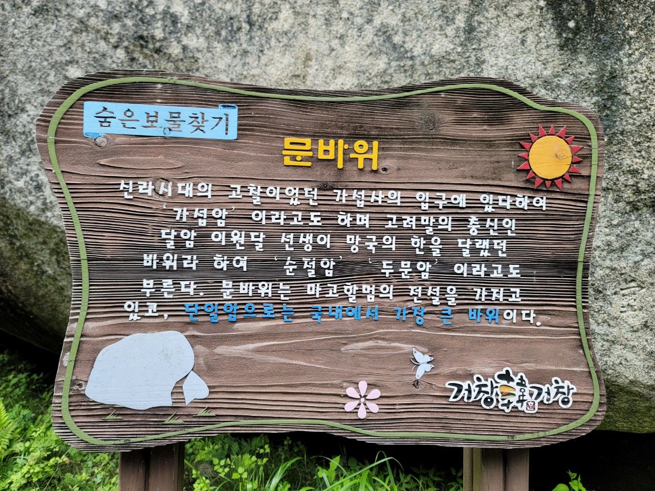 📌 현성산은 백색 화강암반으로 되어 있으며 국내 최대 거대한 바위인 문바위와 보물 가섭암지 마애여래삼존입상이 바위 속에 숨어 있는 곳입니다. 마애여래삼존입상은 가섭암이라는 고려시대 절에 있었던 삼존불로 추정하고 있으며 1111년 제작한 것으로 되어 있습니다.