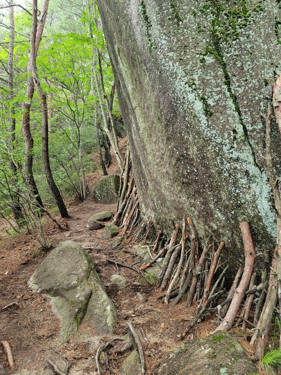 넘어지지 말라고 받쳐놓은 산행인들의 정성에 웃음이 나서 한숨 돌리고~~