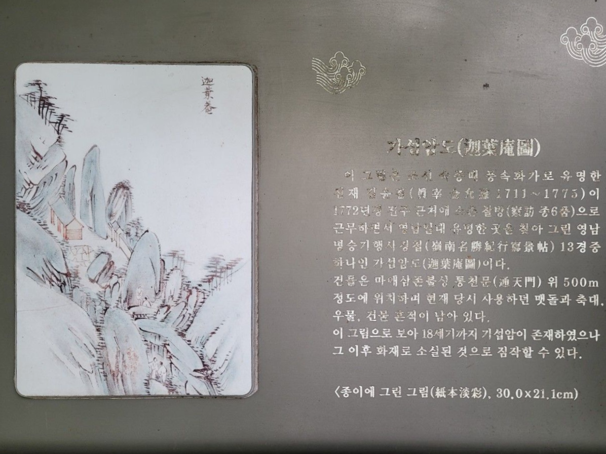 예전에는 있었다는 가섭암 그림 설명도 다시 천천히 살펴보니 가섭암이 지금까지 있었으면 정말 좋았을 것 같다는 생각이 들었습니다. 암릉이 가득한 곳에 있는 고즈넉한 사찰, 운치 있고 아주 좋았을 것 같네요~