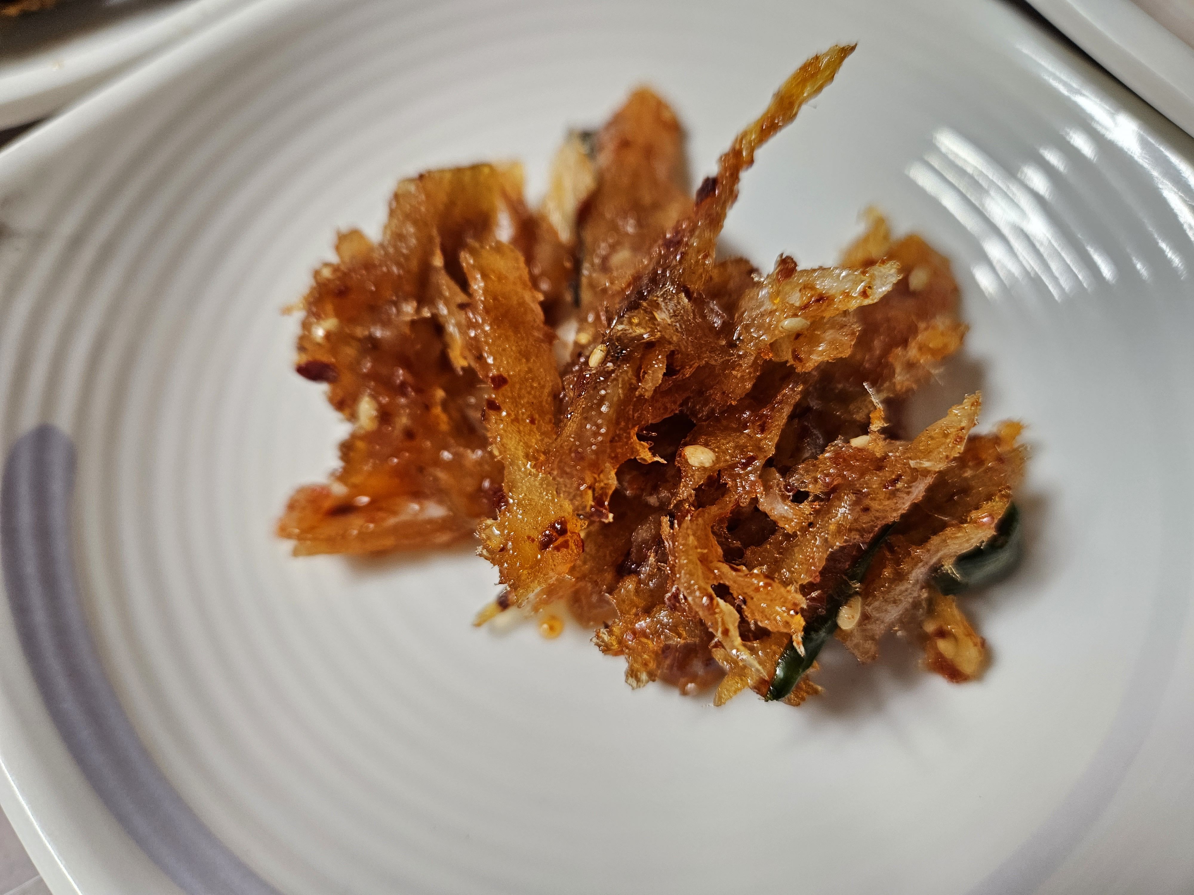 고추튀각과 쥐포무침~비가 내려서인지 고추튀각이 바삭하지 않아 조금 아쉬웠지만 맛있었습니다.