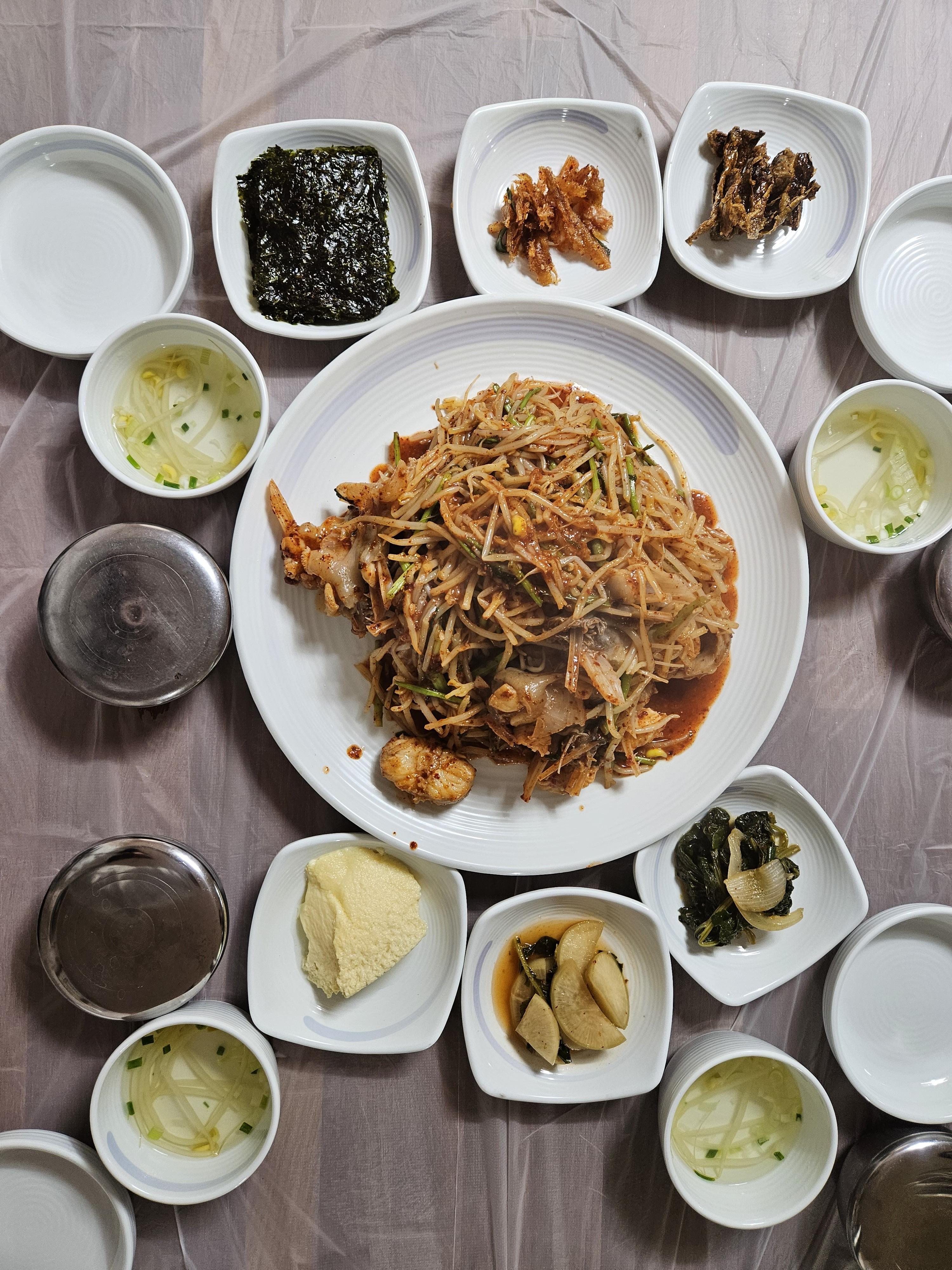 주문한 아귀찜이 나왔습니다. 기본 반찬과 아귀찜이 아주 깔끔해 보입니다.