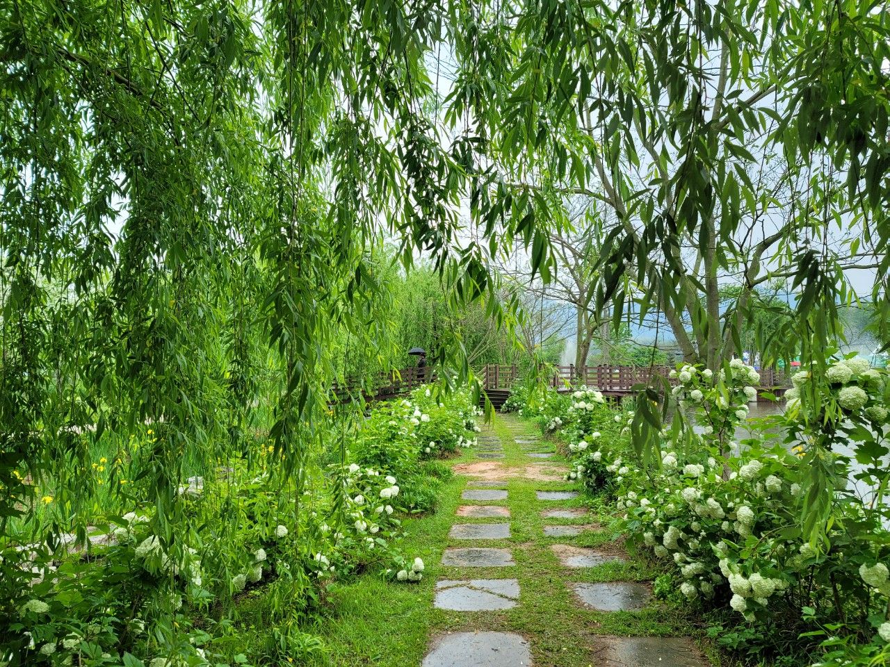 분수도 시원하게 나오고 있고 호수 가장자리로 수국이 한창이었습니다. 불두화와 흡사하고 동그란 꽃 봉오리가 참 이쁘답니다. 사실 수국과 불두화 구분을 정확히 하지 못하고 있습니다.^^