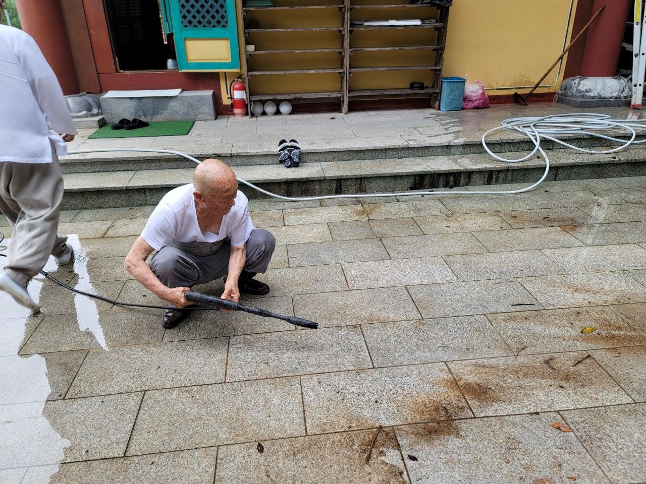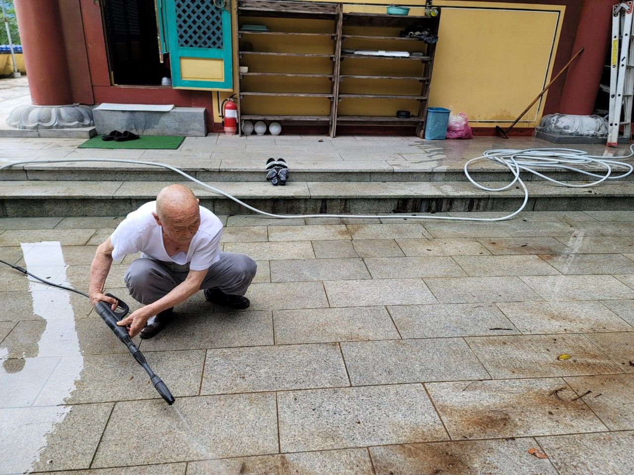 많은 물 때문에 흘러내린 토사를 스님께서 청소하고 계셨는데요. 허리가 아프신지 복대를...