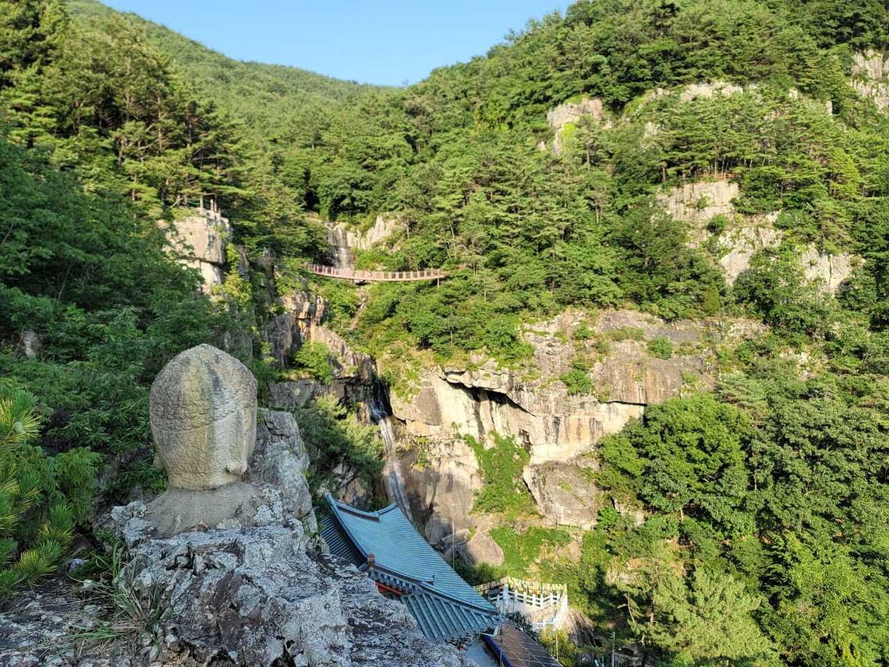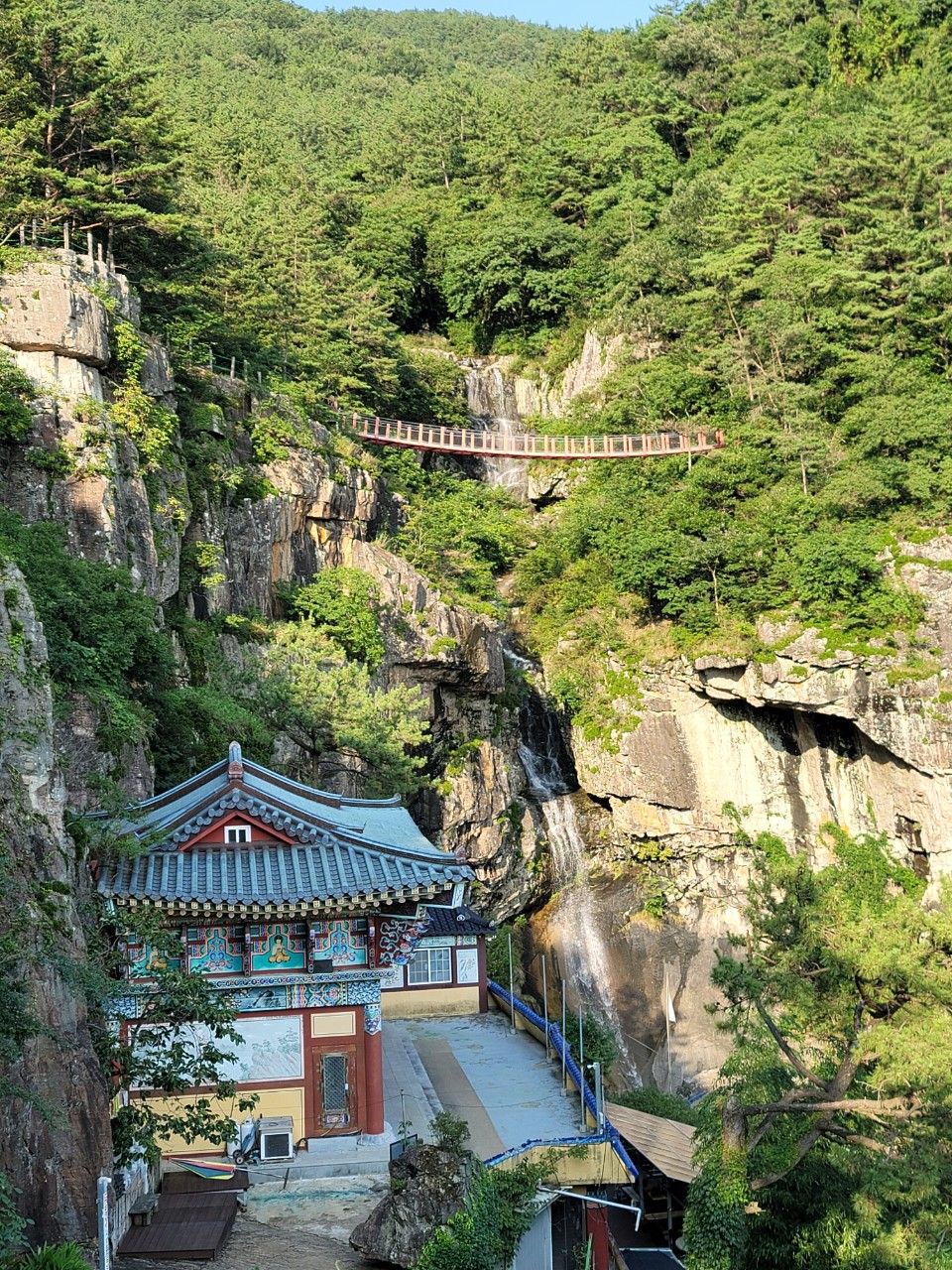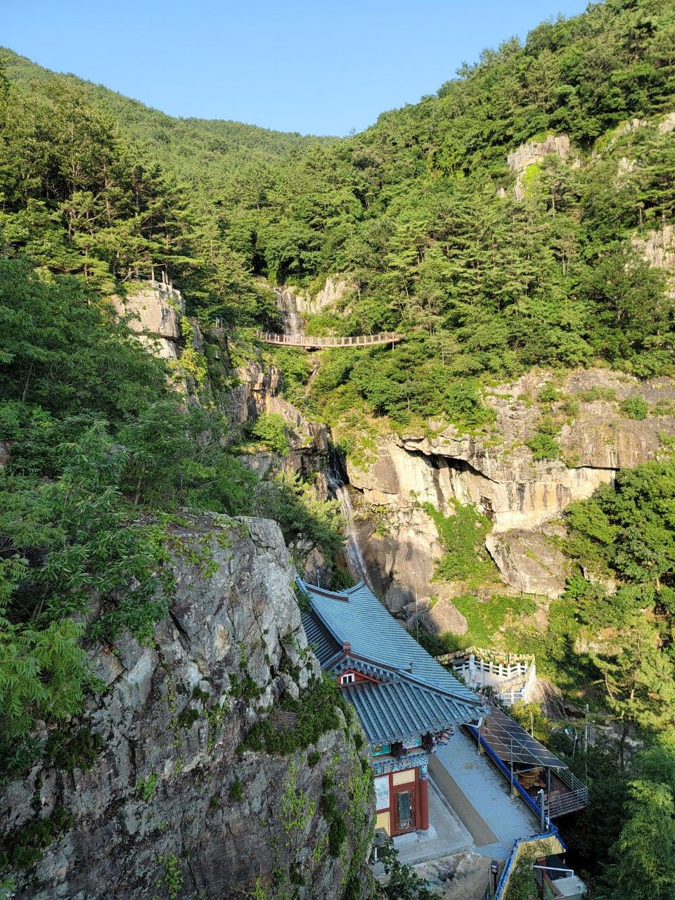 폭포암 전경도 천천히 한 번 살펴보고 여행을 마무리했습니다. 통영이나 거제, 고성 근처 가볼 만한 곳으로 시원한 폭포와 스릴만점 출렁다리가 있는 구절산 폭포암 추천합니다.