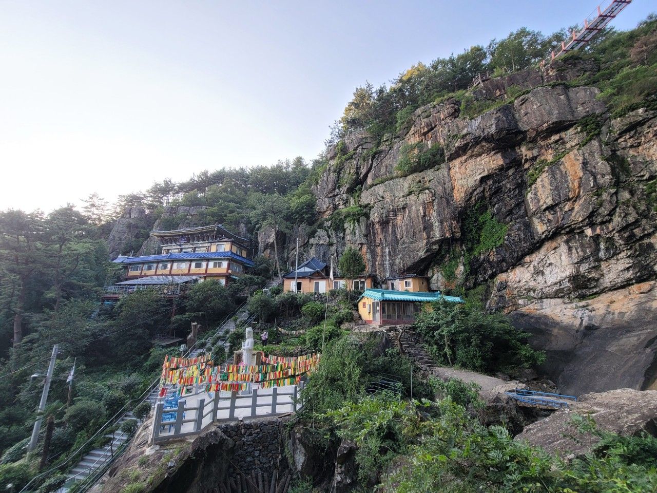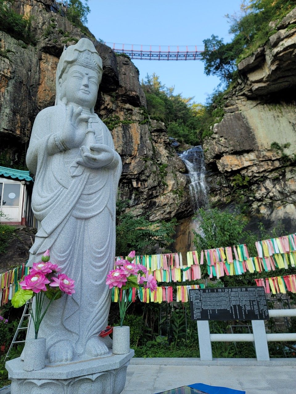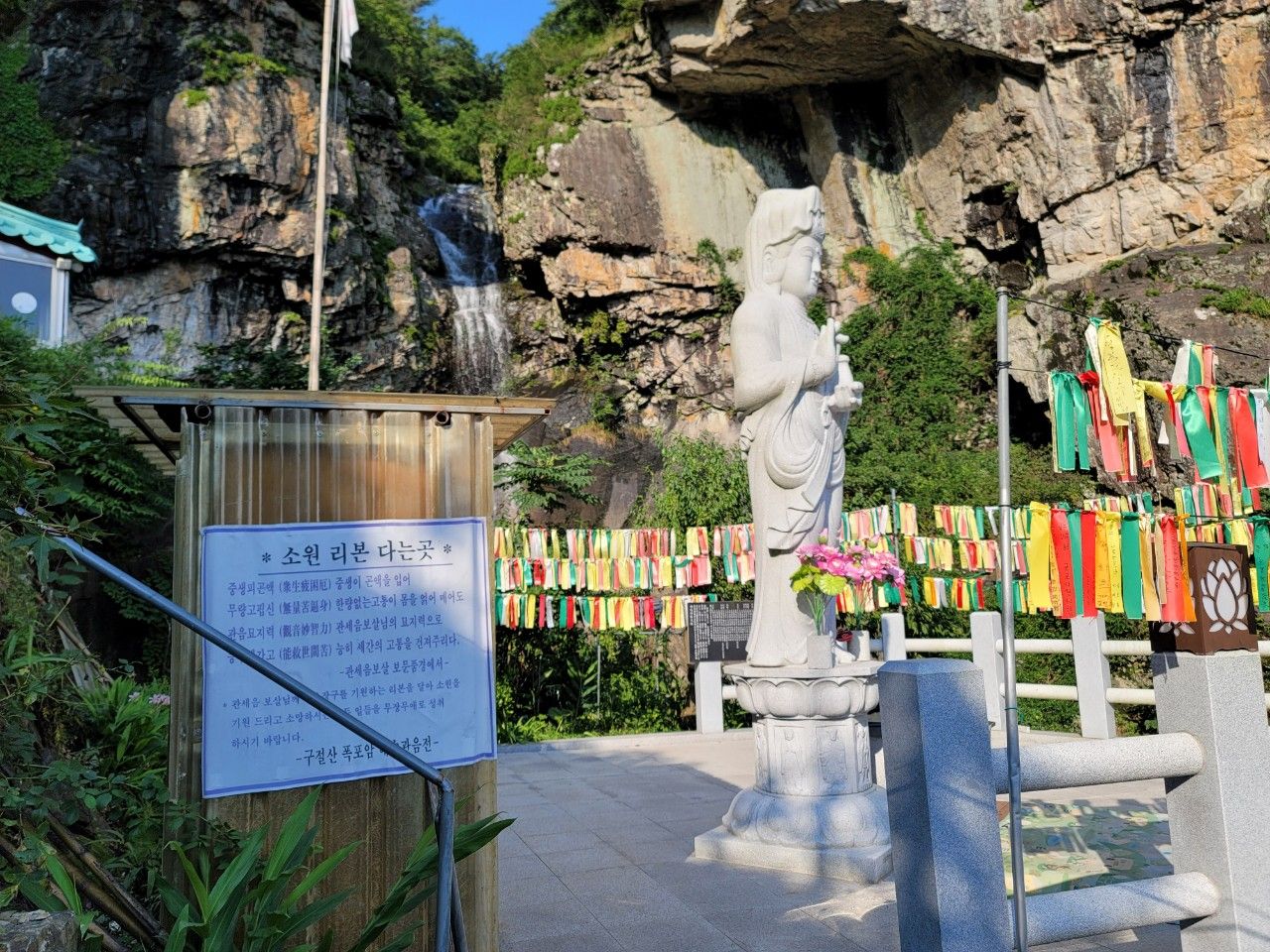 폭포암 전경도 천천히 한 번 살펴보고 여행을 마무리했습니다. 통영이나 거제, 고성 근처 가볼 만한 곳으로 시원한 폭포와 스릴만점 출렁다리가 있는 구절산 폭포암 추천합니다.