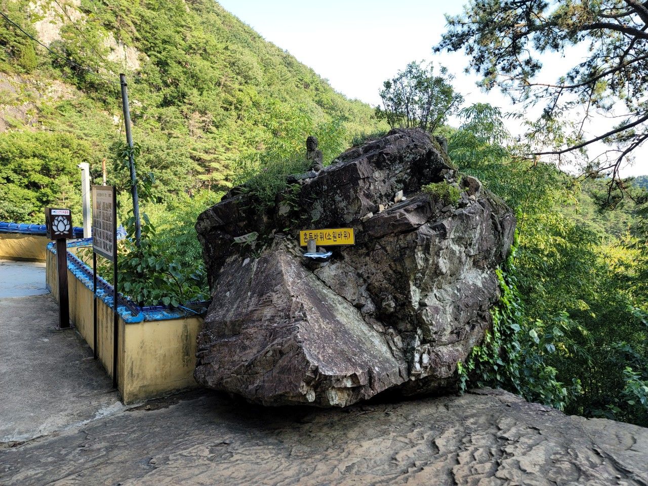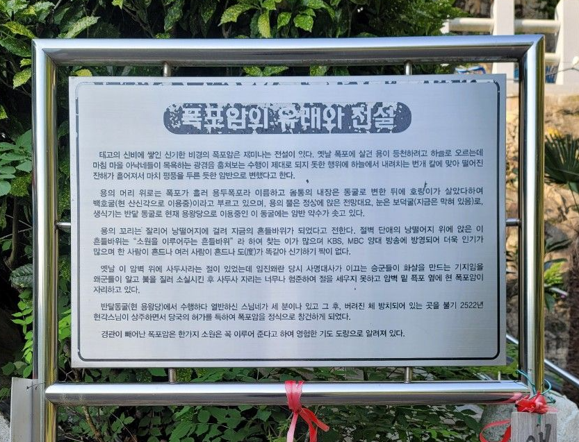폭포암 유래와 전설도 읽어 보았는데요. 폭포에 살던 용이 승천하려다 목욕하는 아낙네를 훔쳐보다 천벌을 받고 떨어졌다네요. 머리 위로는 용두폭포, 몸통은 백호굴, 뿔은 전망대, 눈은 보덕굴, 생식기는 용왕당, 꼬리는 흔들바위가 되었다고 합니다. 잔인한 듯 흥미로운 전설입니다.