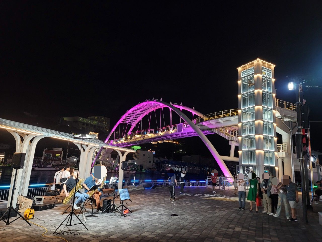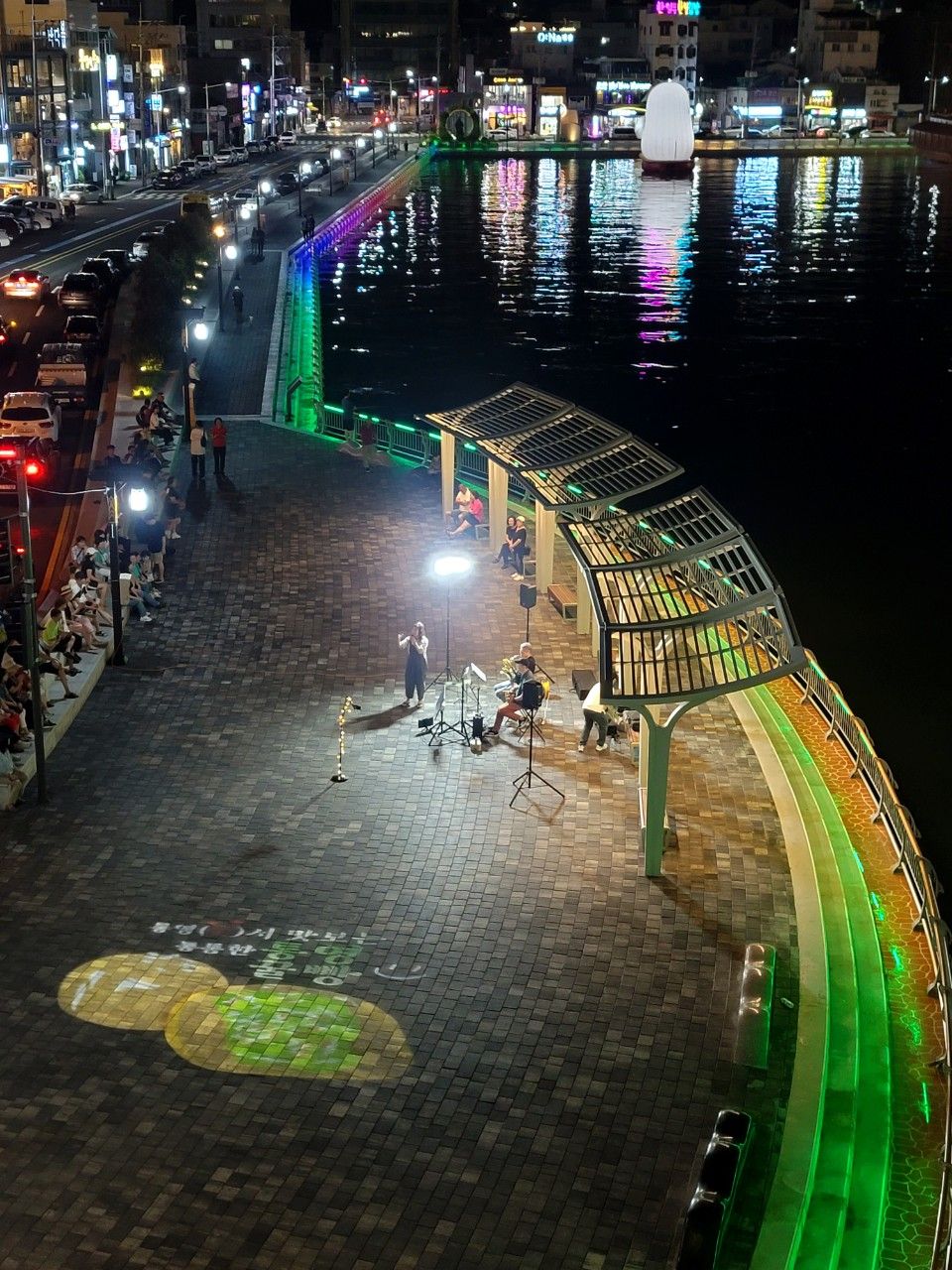 강구안 보도교 쪽 야경을 보러 가는 길에 버스킹을 하고 있는 연주 팀도 보았는데요. 모니터에 나오는 가사를 따라 많은 관람객이 함께 즐기는 모습도 보기 좋았답니다.