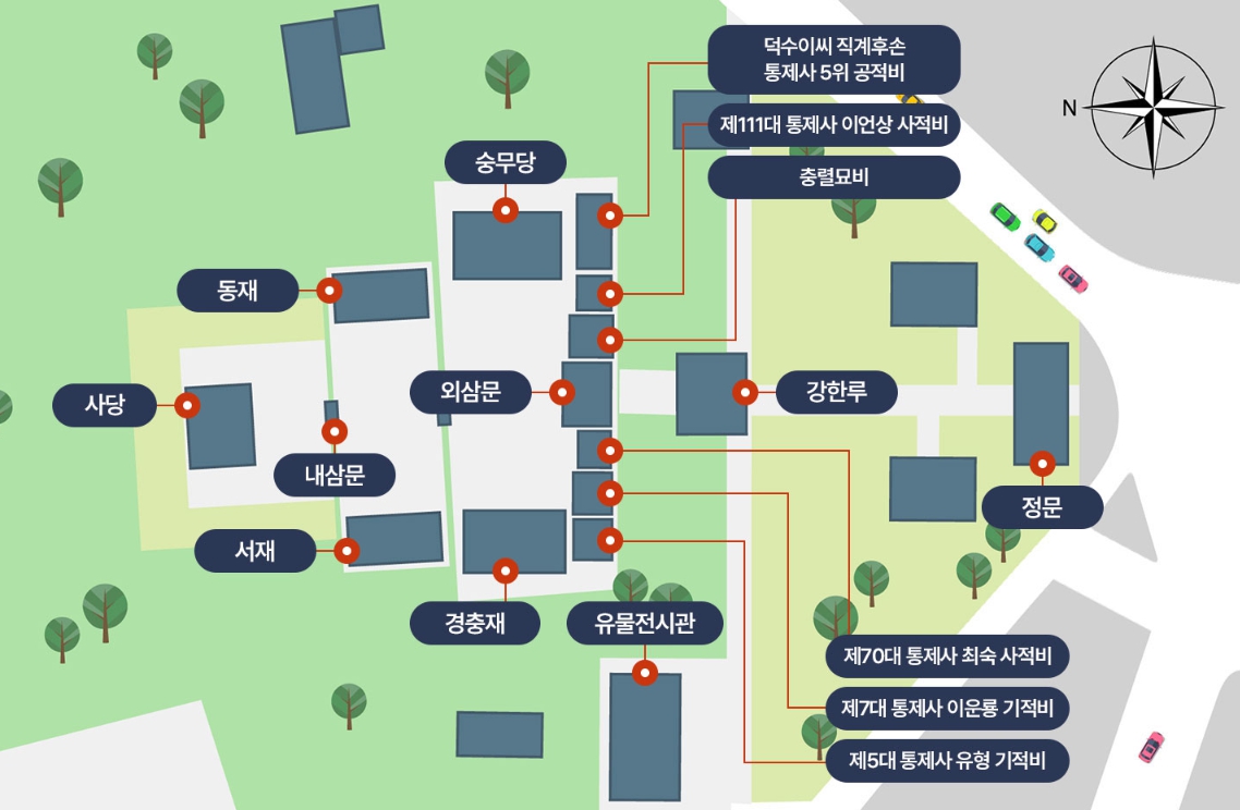 통영 충렬사 안내도입니다. 정문을 기준으로 보시면 편하게 확인하실 수 있습니다.
