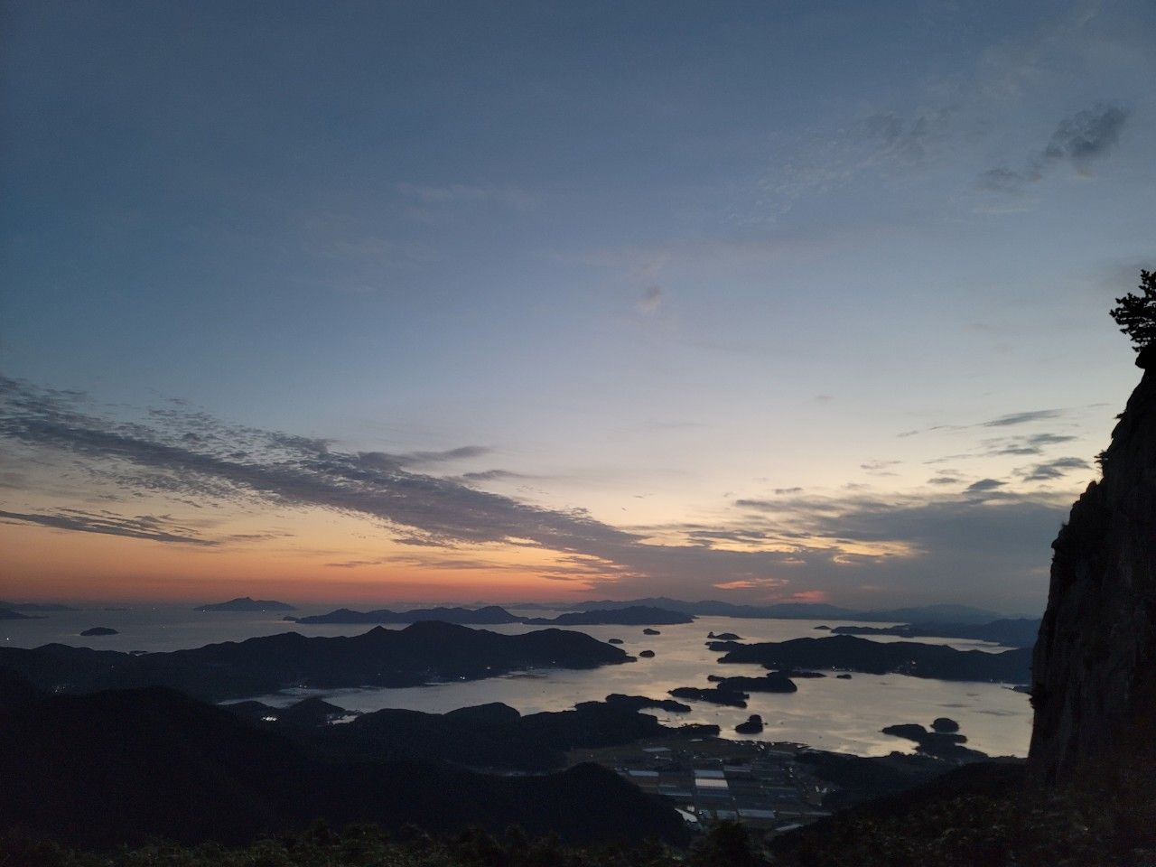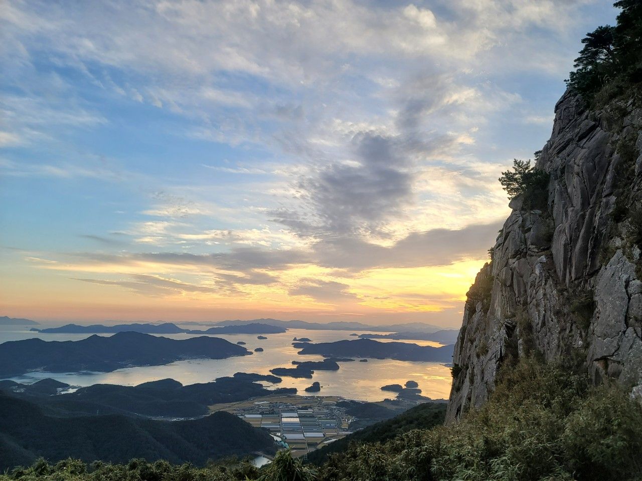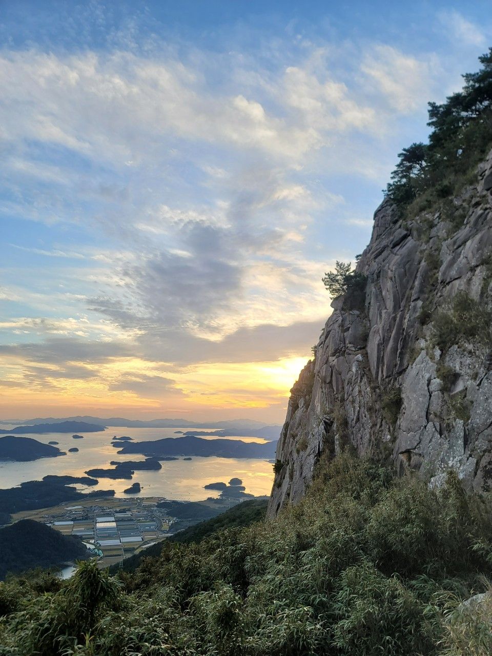경남 통영은 한려해상국립공원으로 주변이 아기자기한 섬으로 가득합니다. 일몰 시간 이쁜 섬과 바다, 붉게 타는 하늘의 조화는 어떤 색으로도 표현이 되기 힘든 것 같습니다. 「미륵산」 461m