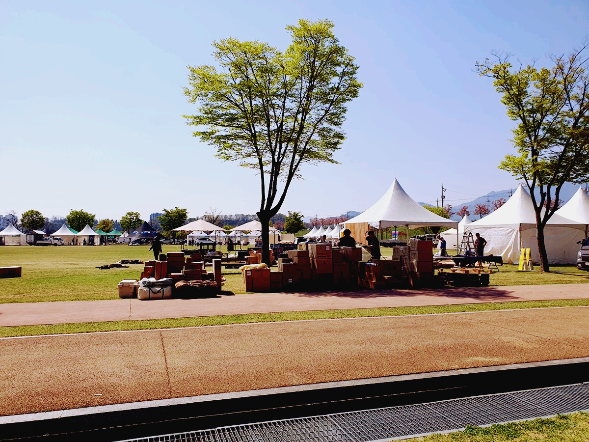 드론으로 전체 모습 촬영해 보았습니다. 넓은 낙동강 체육공원에 캠프 참가자들이 가득~~ 속속 모여들고 있어 늦은 오후가 되면 시끌시끌할 것 같습니다.