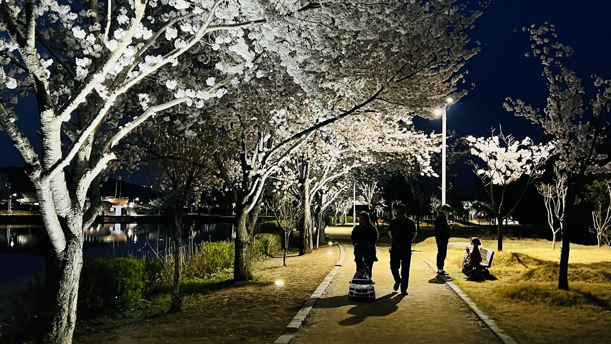 조명과 어우린진 지산샛강 생태공원 벚꽃길 참 이쁩니다. 낮과는 또 다른 매력이 넘치는 산책길이었습니다.