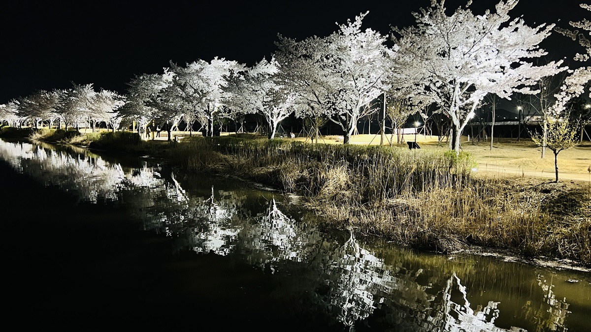 조명과 어우린진 지산샛강 생태공원 벚꽃길 참 이쁩니다. 낮과는 또 다른 매력이 넘치는 산책길이었습니다.