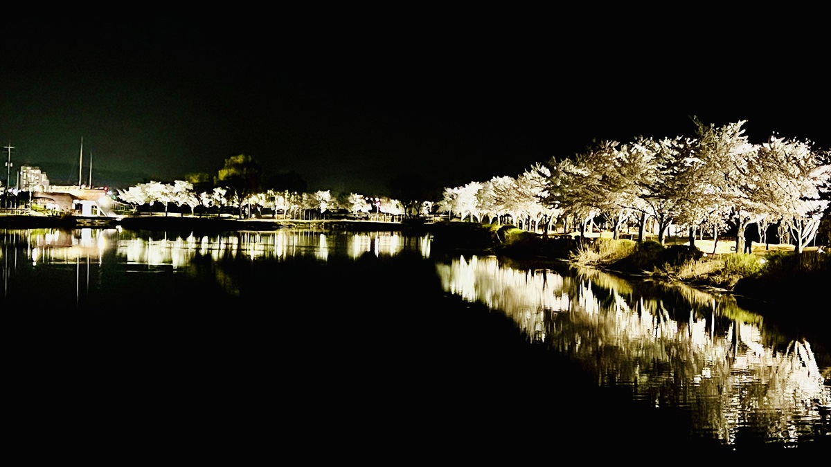 까만 하늘과 물 위에 반영된 벚나무들이 조명에 비춰 정말 아름답습니다. 1년에 딱 한번 지금이 아니면 볼 수 없는 장관입니다.