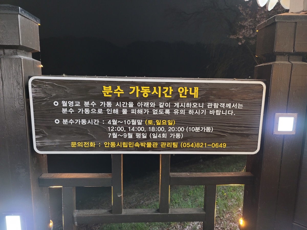 안동 월영교 분수 가동시간 안내도 잘 되어 있네요. 4월부터 10월말까지 토,일요일(7~9월은 평일도) 하루 4회(12시, 14시, 18시, 20시) 10분간 가동한다고 하니 참고 하세요~