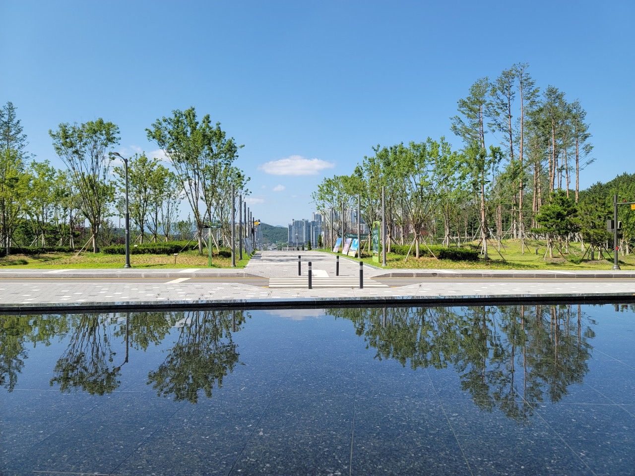 구미다온숲 뷰포인트 미러폰드입니다. 바람이 불지 않는 날이면 물속에 비친 공원의 모습이 아주 이쁘게 담기는 곳이네요~