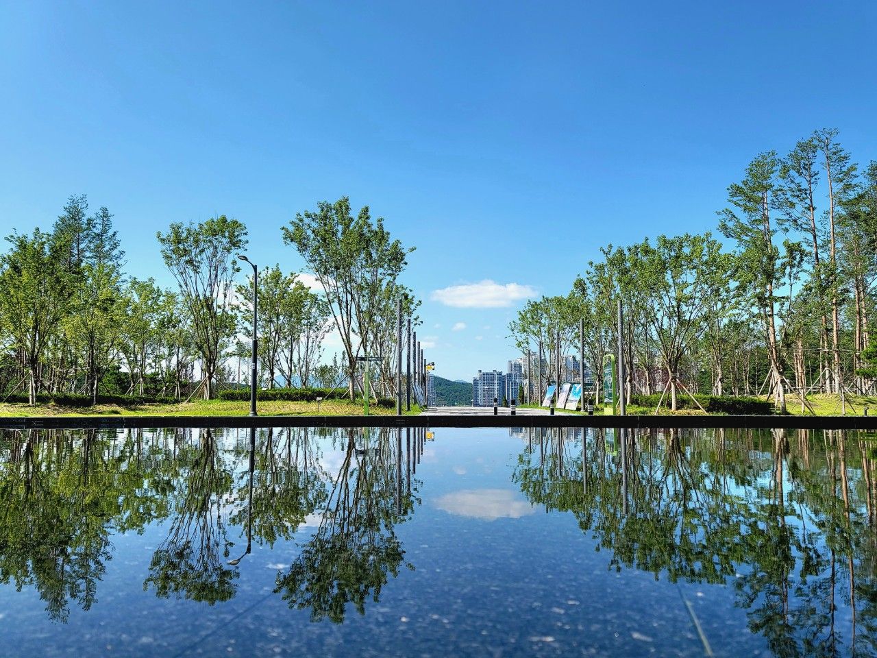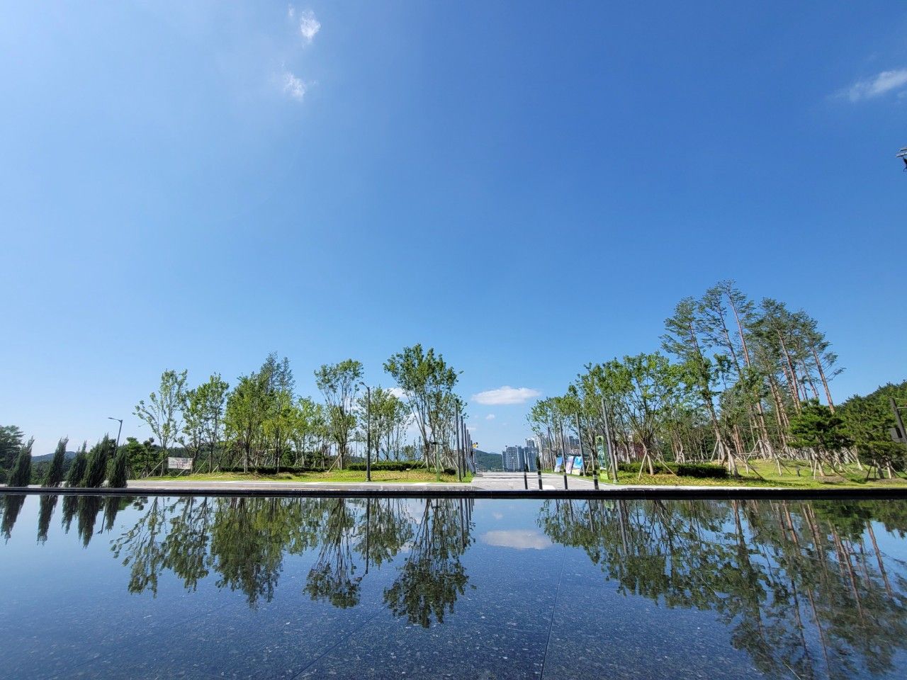 구미다온숲 뷰포인트 미러폰드입니다. 바람이 불지 않는 날이면 물속에 비친 공원의 모습이 아주 이쁘게 담기는 곳이네요~
