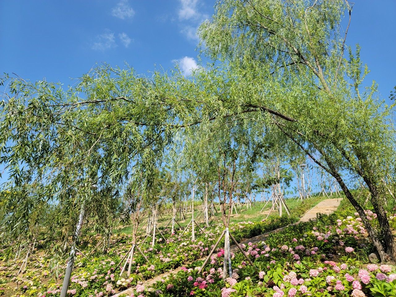 살짝 힘들어보이는 버드나무가 목이 마른 지 고개를 한껏 숙이고서 수국에게 준 물을 먹고 싶은가 봅니다.