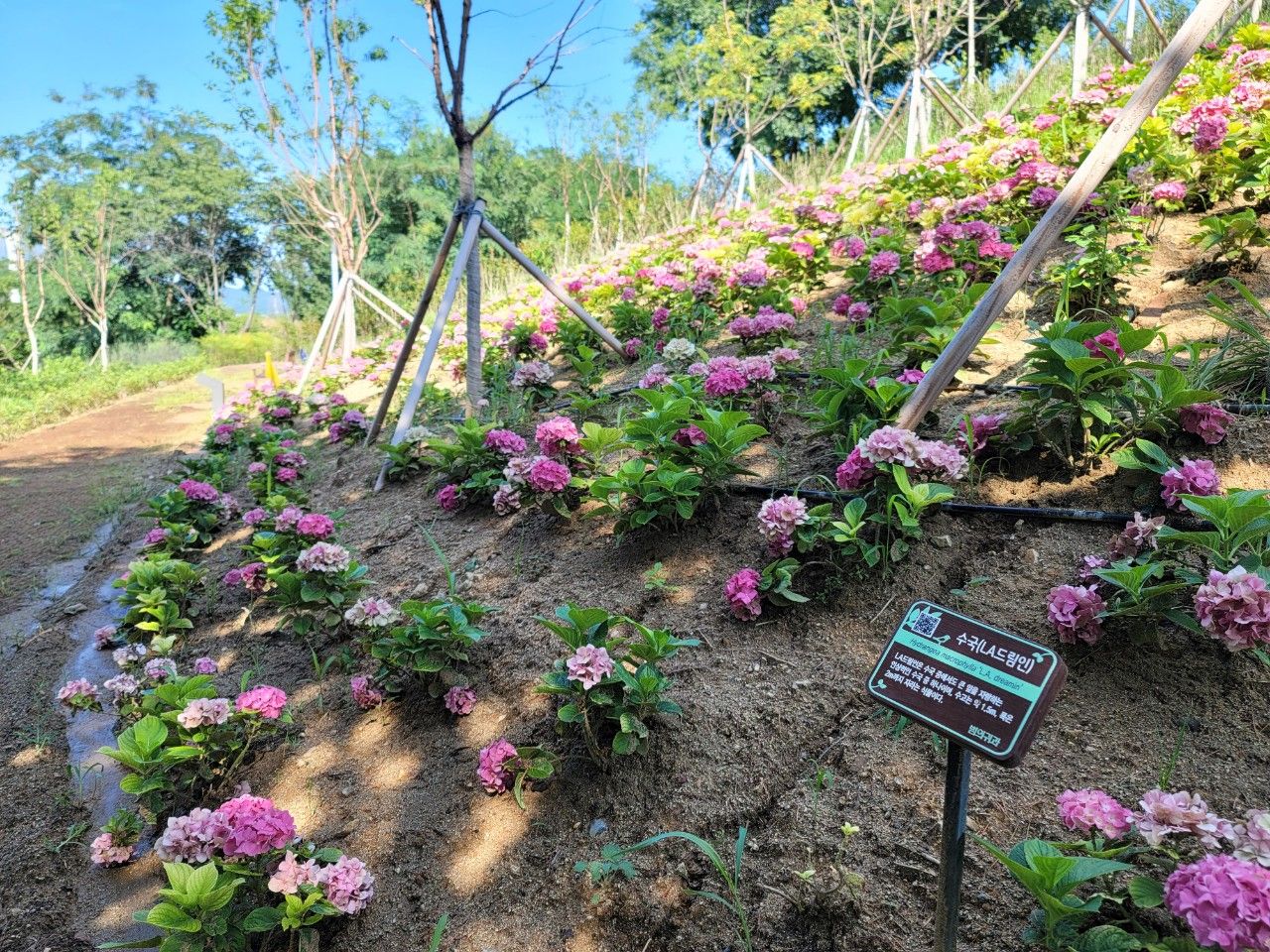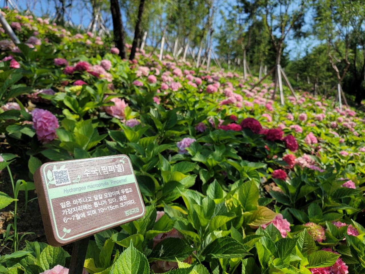 수국원 쪽에는 핌퍼넬이라는 수국들이 있었는데요~ 분홍색과 진분홍색이었는데 수국이 토질과 환경에 따라 색이 변하기도 한다고 해 내년에는 어떤 색깔 수국을 볼 수 있을지 기대가 되었답니다.