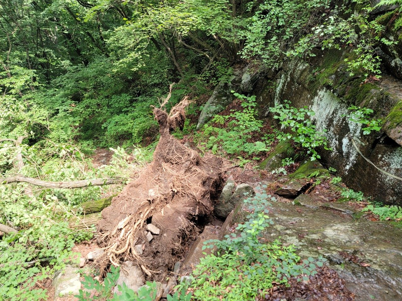 조금 더 오르다 보니 나무와 돌들이 지반이 약해져서인지 뽑혀 있었습니다. 폭우 뒤 산행하신다면 특히 더 조심하시기 바랍니다.