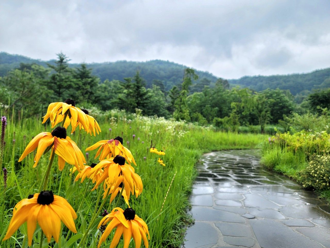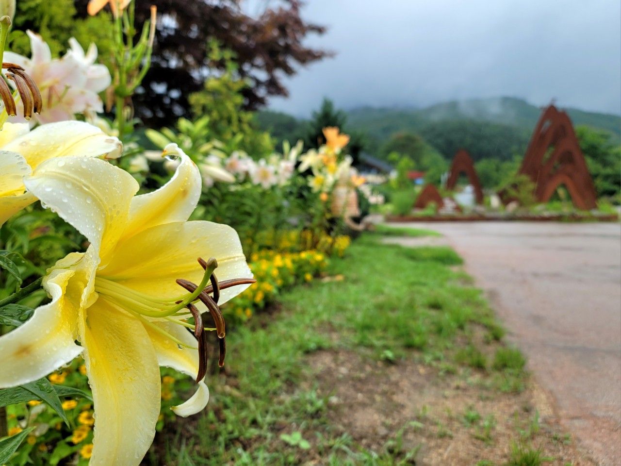다리 건너자마자 어찌나 진한 꽃향기가 나는지 폭우 속에서도 향을 잃지 않더라구요~ 백합인 듯싶은 꽃들이 만개해 진한 향을 뿜어주고 있었습니다.