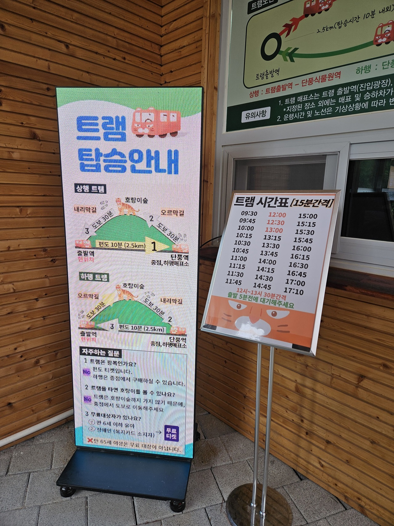 트램 탑승안내와 시간표 참고하세요~ 9시 30분부터 17시 10분까지 15분 간격으로 운행하고 점심시간에는 30분 간격이네요~